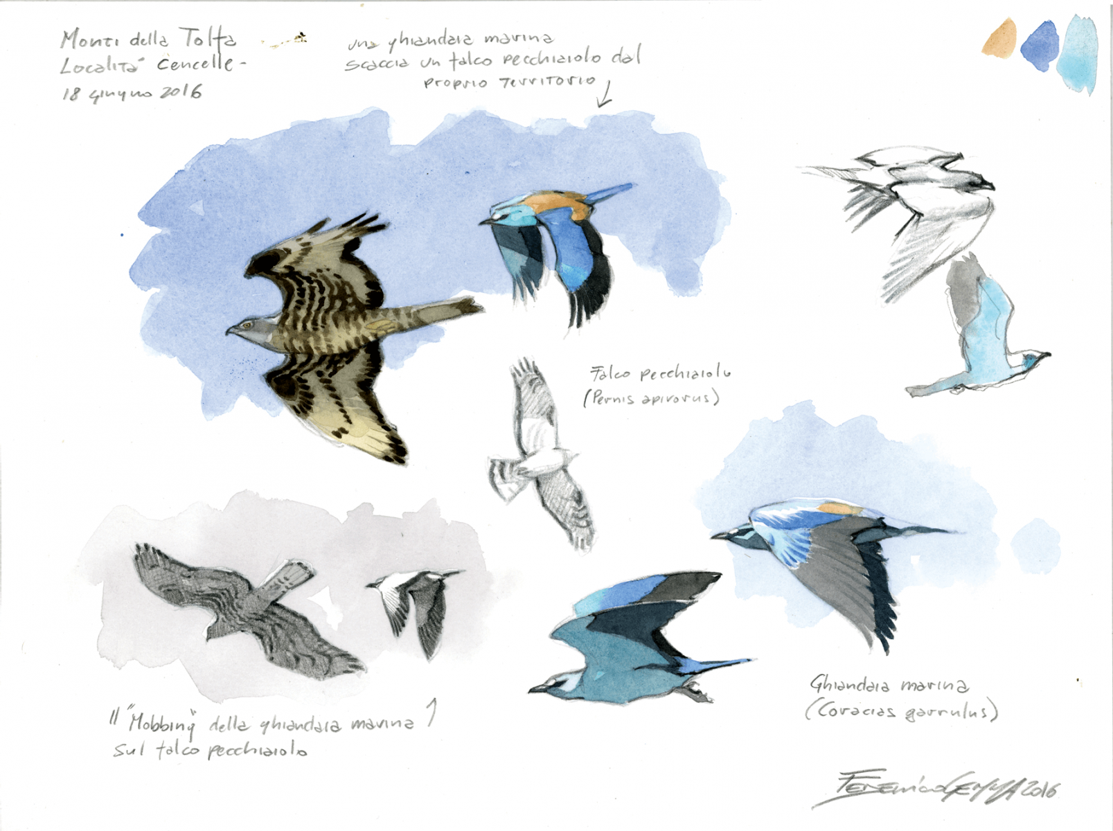 « Situés au nord de Rome, les Monti della Tolfa forment une vaste région de forêts et de pâturages. Je m’y rends souvent pour dessiner les rapaces. Aujourd’hui, mon attention est focalisée sur un couple de rolliers d’Europe perchés en haut d’un vieux chêne. Les oiseaux sont calmes, mais soudainement l’un des deux s’envole comme s’il avait été dérangé. Enfermé dans ma voiture et à bonne distance, je me dis que ce n’est pas de ma faute… Et là, l’intruse fait son apparition: une bondrée apivore! Gourmande de larves et de nids de guêpes, elle est totalement inoffensive pour ces oiseaux colorés. Mais visiblement, elle est passée trop près de leur territoire en les inquiétant… C’est d’ailleurs seulement une fois que le rapace plane au loin que le rollier revient se poser sur sa branche. »