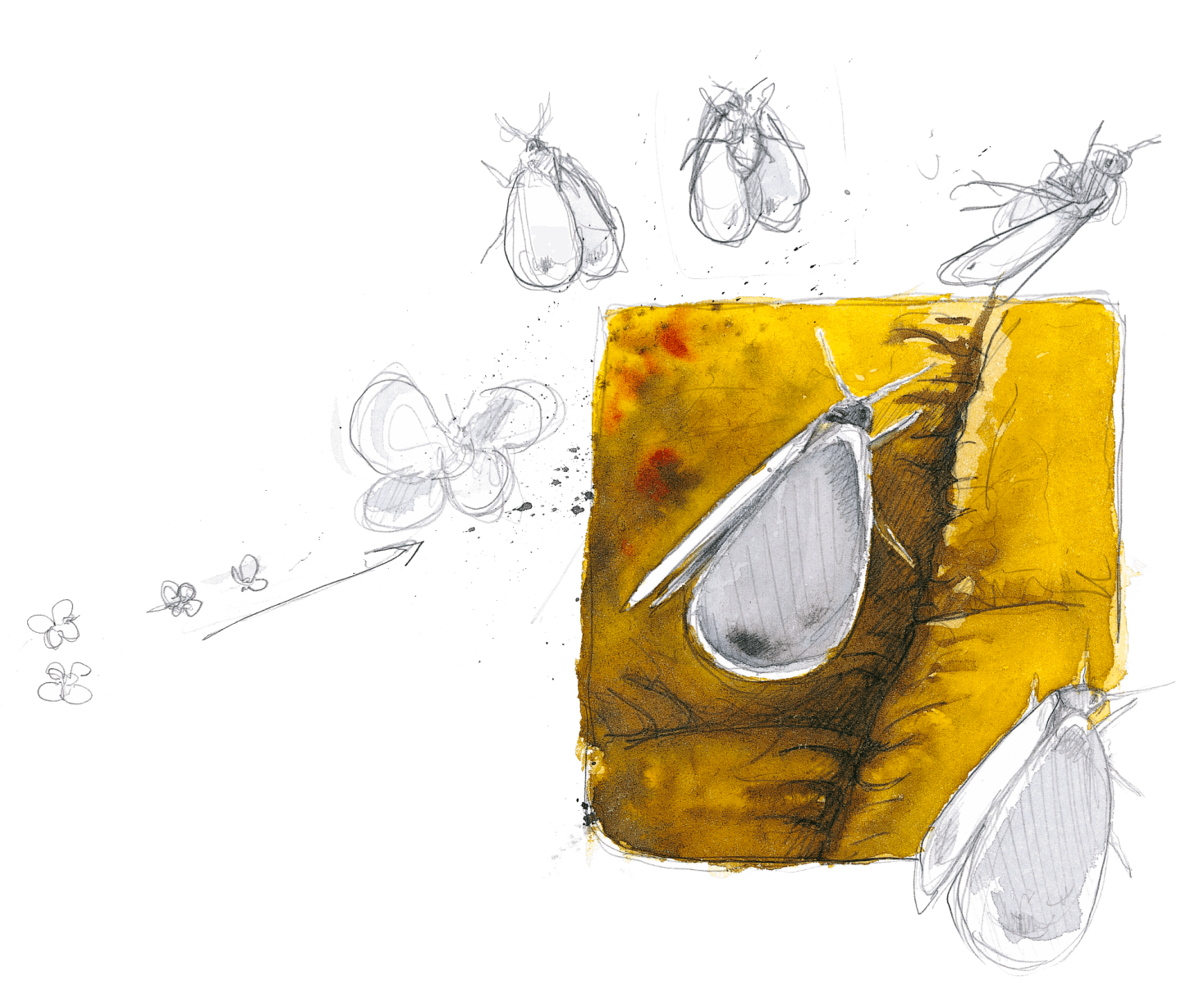 Dérangé, un aleurode s'enfuit en papillonnant. Ses ailes délicates doivent leur couleur à une fine couche cireuse. Cet insecte suceur de sève peut peupler en grand nombre le revers des feuilles. Les jardiniers le connaissent sous le nom de « mouche blanche ». Beaucoup le considèrent comme un fléau. La ronce qui l'héberge semble s'en accommoder sans grands dommages.