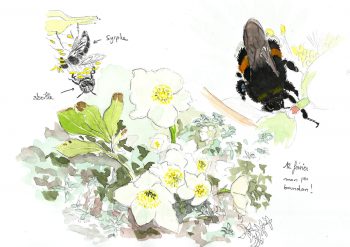 Il n'en fallait pas plus pour entendre vrombir la plus dodue et la plus hâtive des butineuses. La reine bourdon s'annonce toujours à l'oreille avant de s'offrir en spectacle. Je sais où elle se cache car je connais un bar à nectar déjà ouvert à cette date. Bingo! Notre abeille à fourrure se vautre avec délectation dans la corolle de l'hellébore noir, aussi appelé rose de Noël. Cette fleur d'hiver, de la famille des renoncules, n'a en fait rien d'une rose et elle est blanche. C'est une cousine du sauvage hellébore fétide qui vit en lisière du bois de frênes voisin.