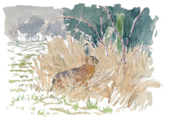 J’ai vu un hibou, mais aussi beaucoup de lièvres. Ces capucins bossus, comme on les surnomme, affectionnent ce milieu très ouvert. Depuis quelques jours, je retourne sur les lieux dans l’après-midi sans toutefois sortir de la voiture. Elle est mon poste d’affût : couverture sur les genoux, matériel de dessin étalé sur le siège passager, jumelles et longue-vue à la fenêtre. Il n’y a pas grand-chose à voir quand j’arrive. Un crécerelle vole en Saint-Esprit, une corneille passe… Ah ! Un deuxième faucon apparaît, puis un busard chassant au ras des tiges sèches. Au loin, deux chevreuils se redressent, leurs oreilles en alerte, et un lièvre lève la patte pour se toiletter… Petit à petit, la plaine prend vie.