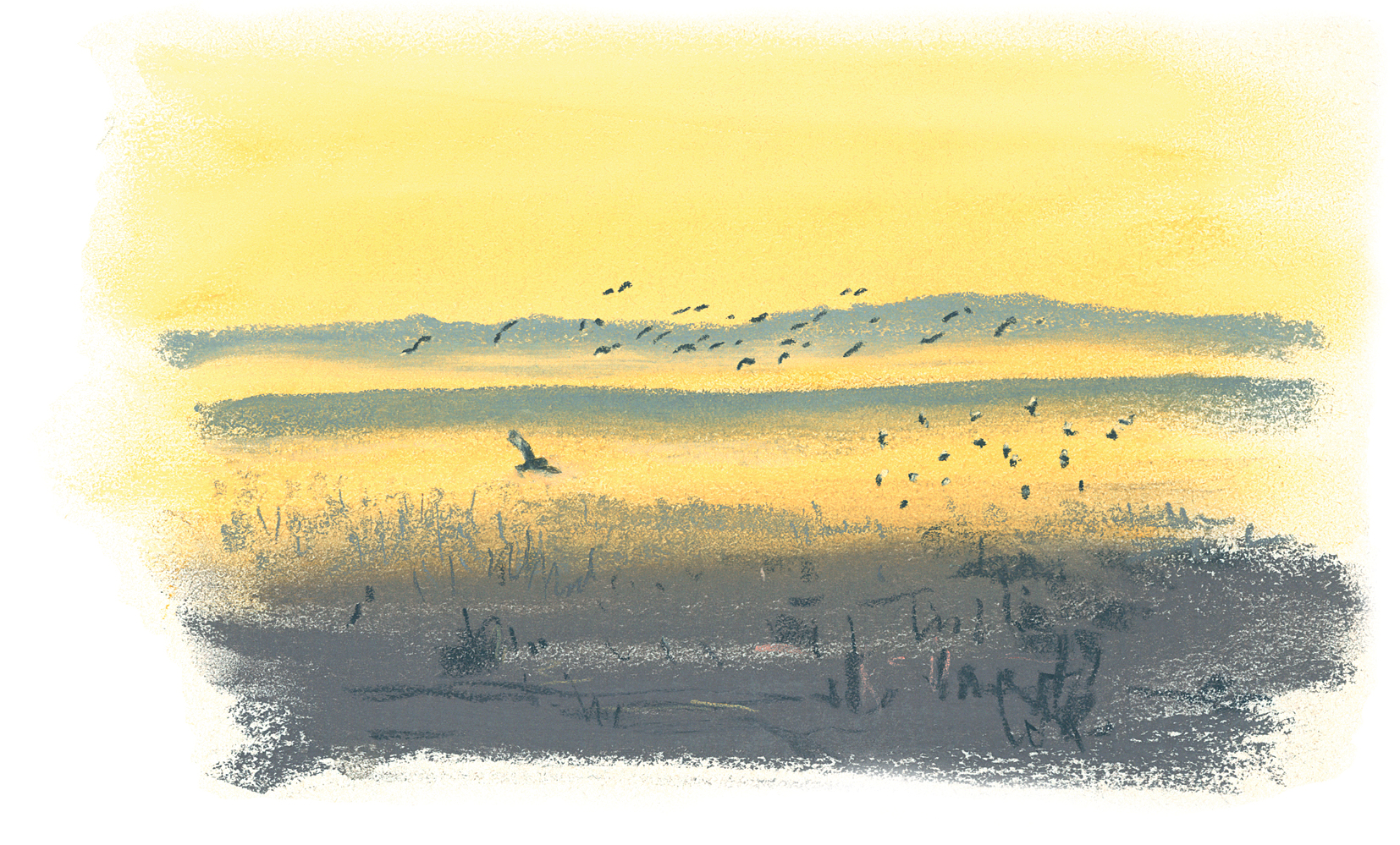 Le dessin aide à patienter. Le soleil descend et des lièvres arrivent de-ci de-là, bientôt suivis par les hiboux. Deux perdrix grises passent en vol en criant. Leurs ailes courtes et arquées, vrombissantes, les propulsent comme des boulets de canon au-dessus des herbes et elles se posent en courant. L’animation est à son comble quand la lumière tombe. Il ne reste que quelques dizaines de minutes pour en profiter…