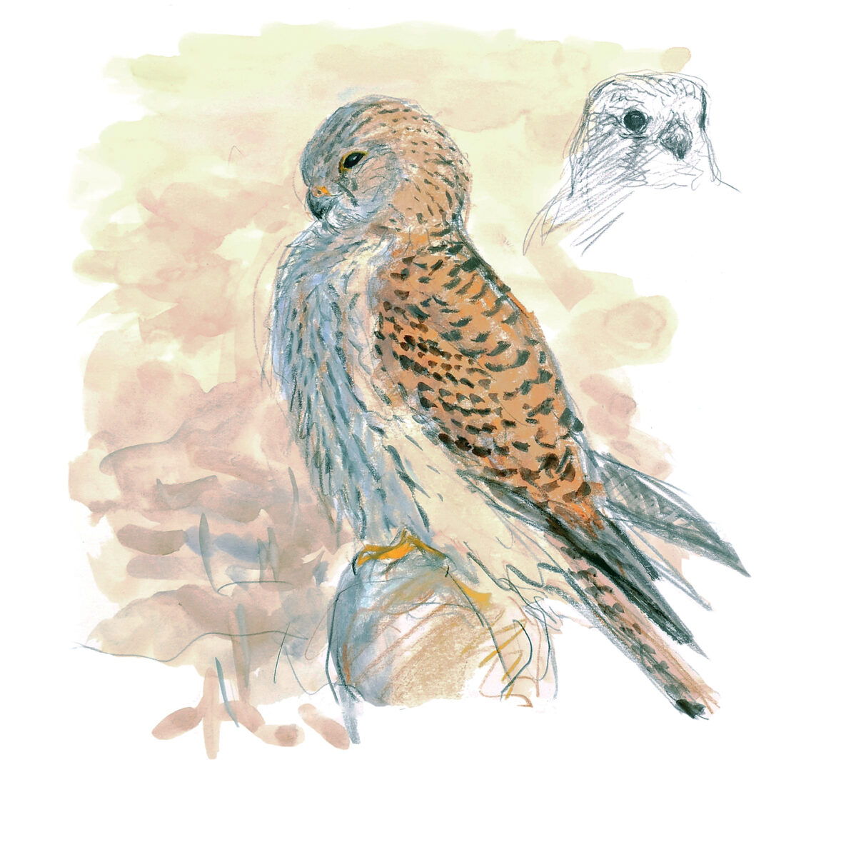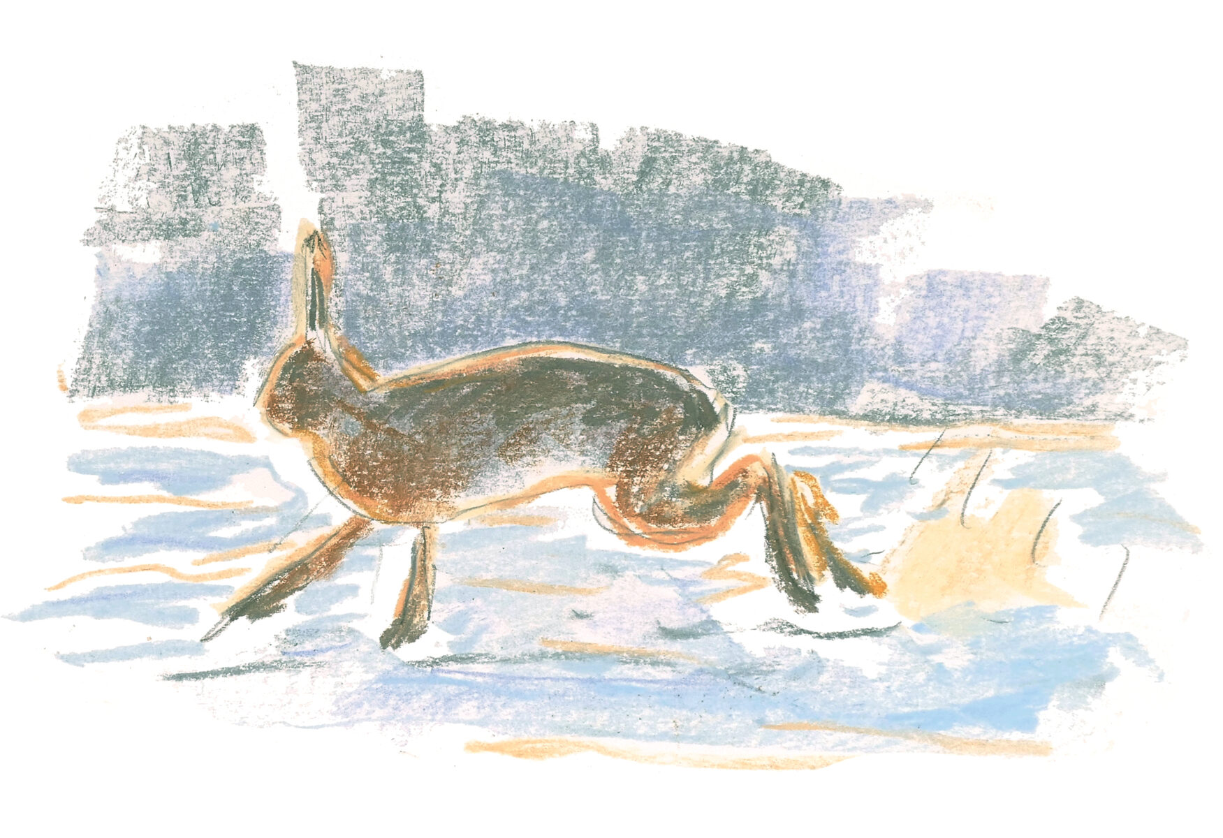 J’ai vu un hibou, mais aussi beaucoup de lièvres. Ces capucins bossus, comme on les surnomme, affectionnent ce milieu très ouvert. Depuis quelques jours, je retourne sur les lieux dans l’après-midi sans toutefois sortir de la voiture. Elle est mon poste d’affût : couverture sur les genoux, matériel de dessin étalé sur le siège passager, jumelles et longue-vue à la fenêtre. Il n’y a pas grand-chose à voir quand j’arrive. Un crécerelle vole en Saint-Esprit, une corneille passe… Ah ! Un deuxième faucon apparaît, puis un busard chassant au ras des tiges sèches. Au loin, deux chevreuils se redressent, leurs oreilles en alerte, et un lièvre lève la patte pour se toiletter… Petit à petit, la plaine prend vie.