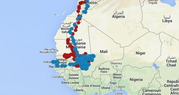 Milou (en bleu) a fait le yoyo entre le Sud de la Mauritanie et le Mali, avant de se décider pour... le Sénégal. C'est le 10 novembre 2014 qu'il a quitté la région malienne où il se trouvait depuis un mois. Après un voyage de 5 étapes journalières, dont l'une comptabilisait 250 km, il a atteint l'ouest du Sénégal. Fidèle à ses habitudes, il séjourne actuellement dans la région de Dakar et dort régulièrement en ville de Thiès. La connaissance des lieux acquise au fil de ces 3 ans de suivi est un sérieux atout pour la recherche de nourriture.