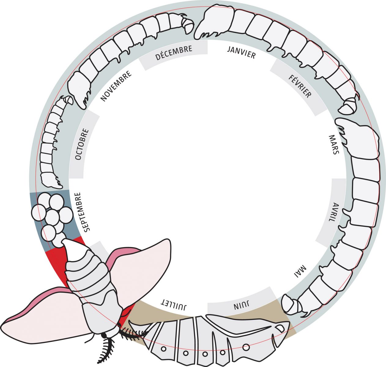 Au début du printemps, la diversité des noctambules croît rapidement. Il est déjà possible de détecter 20 ou 30 espèces dans un jardin verdoyant si les températures sont favorables. Et cette richesse va crescendo jusqu’à la fin de l’été, où 50 à 80 variétés de papillons de nuit peuvent se montrer. Voire davantage. Parmi tout ce petit monde, on distingue les monovoltins et les bivoltins. Rien à voir avec les volts nécessaires au fonctionnement d’une ampoule. Les premiers sont des papillons qui présentent une seule génération adulte par an. Ils volent, se nourrissent – ou pas – et surtout s’accouplent. Puis, les femelles pondent et meurent peu après. Leurs œufs éclosent généralement en automne et les chenilles hibernent. Au printemps suivant, ces petites voraces se nourrissent de leurs plantes-hôtes. Après une pause en chrysalide survient une nouvelle émergence d’adultes, appelés aussi imagos.