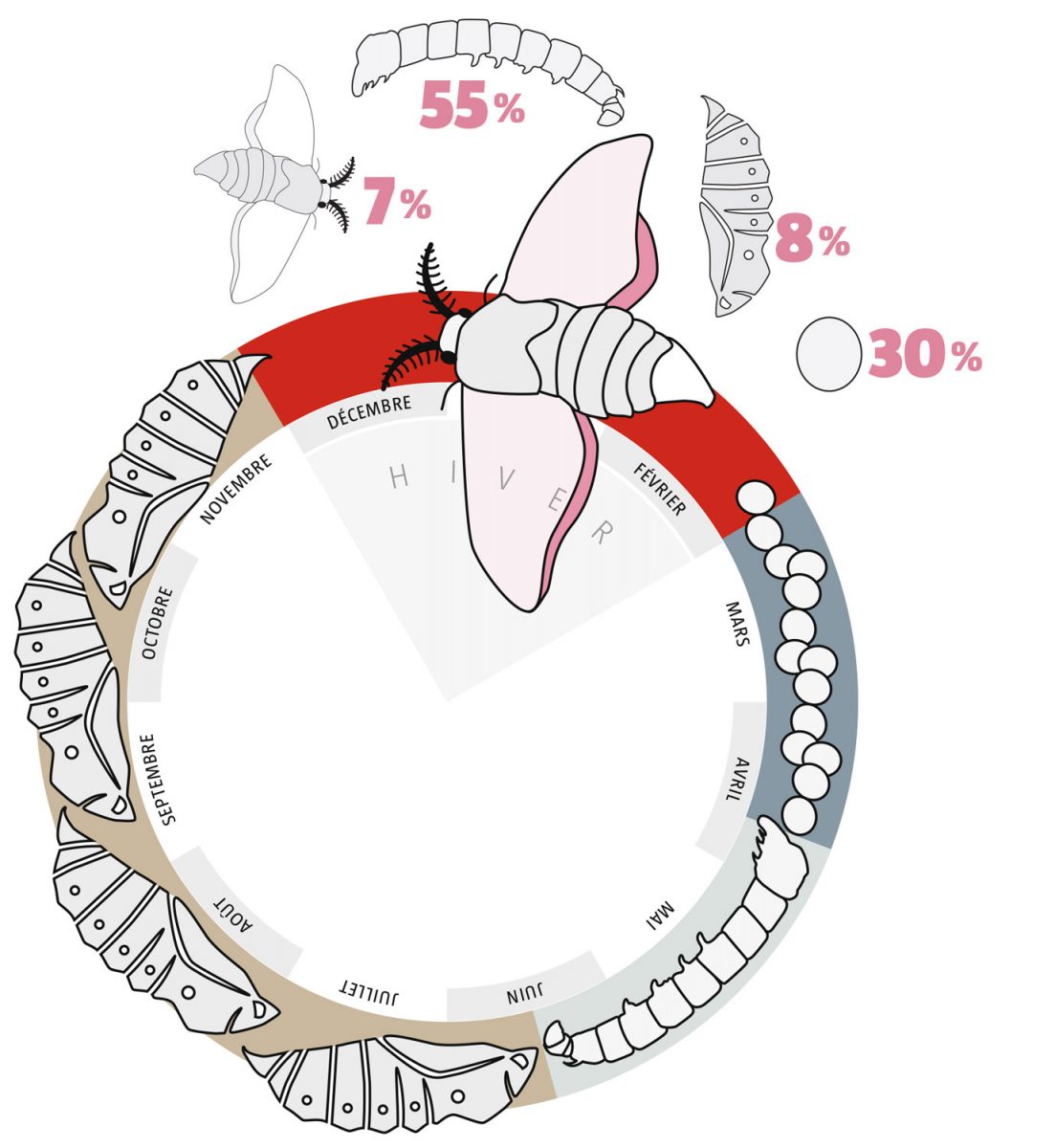Qui n’a jamais ressenti de ferveur printanière à la vue du premier citron ? Et comment ne pas avoir du baume au cœur, un jour de mars, en observant un paon du jour dans les fleurs blanches d’un prunellier ? De jour, les papillons sont des icônes de la belle saison. La nuit en revanche, les cousins poilus du vulcain et du machaon se montrent bien moins frileux. En janvier ou février, la plupart des insectes hibernent sous forme d’œufs ou de reines endormies. Pourtant, en toute discrétion, phalènes et autres orrhodies vont et viennent dans le noir. Certains papillons nocturnes ont en effet une vie adulte centrée sur la mauvaise saison. L’hibernie défeuillante par exemple batifole d’octobre à décembre. Pour la phalène velue en chrysalide au cœur de l’hiver, la vie ailée a lieu en février-mars.