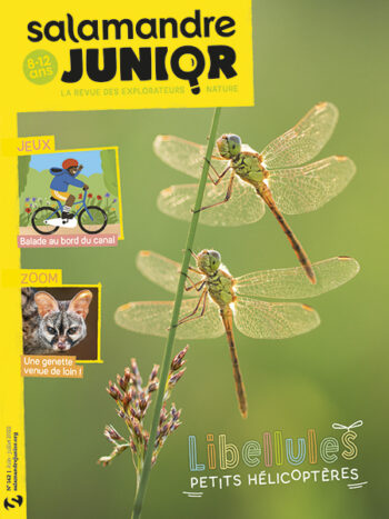 La Salamandre Junior n°142 (juin-juillet 2022) vous donne rendez-vous avec les libellules. Vol stationnaire ou en arrière, changements brusques de direction, les libellules survolent la mare en tous sens. De quoi faire pâlir d’envie les inventeurs d’hélicoptères !