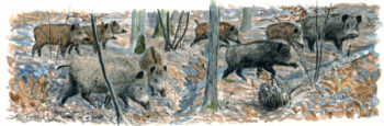 Il est partout, le sanglier. Pour le peintre naturaliste, les occasions d’une observation ne sont pas rares. De la montagne, tant qu’il y a des buissons, jusqu’à la mer, où il visite parfois les plages sous l’œil ébahi des vacanciers. J’ai pu le rencontrer dans le maquis méditerranéen, mais aussi au cœur des roselières des étangs de plaine. Il y trouve le fouillis végétal qu’il affectionne pour se cacher et se reposer en journée. Il aime l’eau et, comme tous les cochons, ce sauvage adore se vautrer dans la boue. Les souilles sont d’ailleurs nombreuses en forêt. Ce bon nageur peut coloniser la moindre île lacustre ou même maritime.