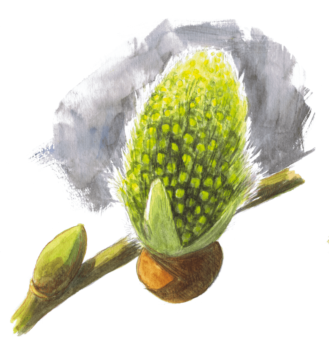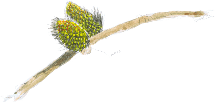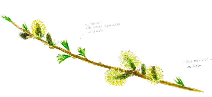 Au sommet de l’arbuste apparaissent les premières feuilles. Elles annoncent une explosion imminente de verdure. Vivement la neige à venir, quand les minuscules graines se détacheront par milliers des fruits mûrs et danseront comme des flocons légers grâce à leurs longs plumets. Le vent tiède du printemps ne sera plus qu’un murmure au contact des branches souples… Comme l’évoquait l’écrivain chinois Lao She, sans le saule, comment connaître la beauté du vent ?