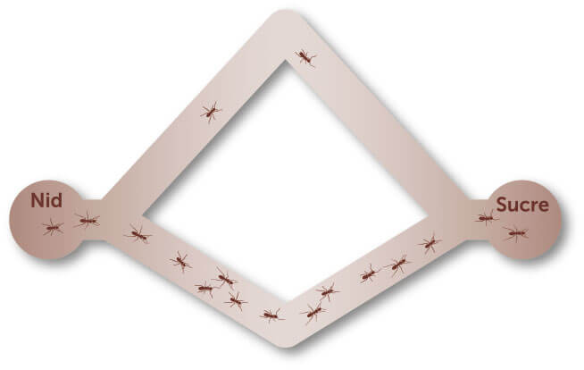 Précisément. Tentons une expérience : on propose à un groupe de fourmis un labyrinthe à deux branches qui mènent toutes les deux à de l'eau sucrée. Une branche est courte, l'autre plus longue. Au départ, les fourmis choisissent au hasard l'un des deux chemins. Bientôt, la voie la plus courte se retrouve plus marquée de phéromones, car les insectes qui l'empruntent la parcourent plus vite. Par effet boule de neige, la piste attire d'autres ouvrières, et au final, toutes empruntent le passage le plus rapide. Nous avons testé des fourmis dans des labyrinthes beaucoup plus compliqués, et cela fonctionne également. Une série de comportements simples permet donc de résoudre des problèmes complexes.