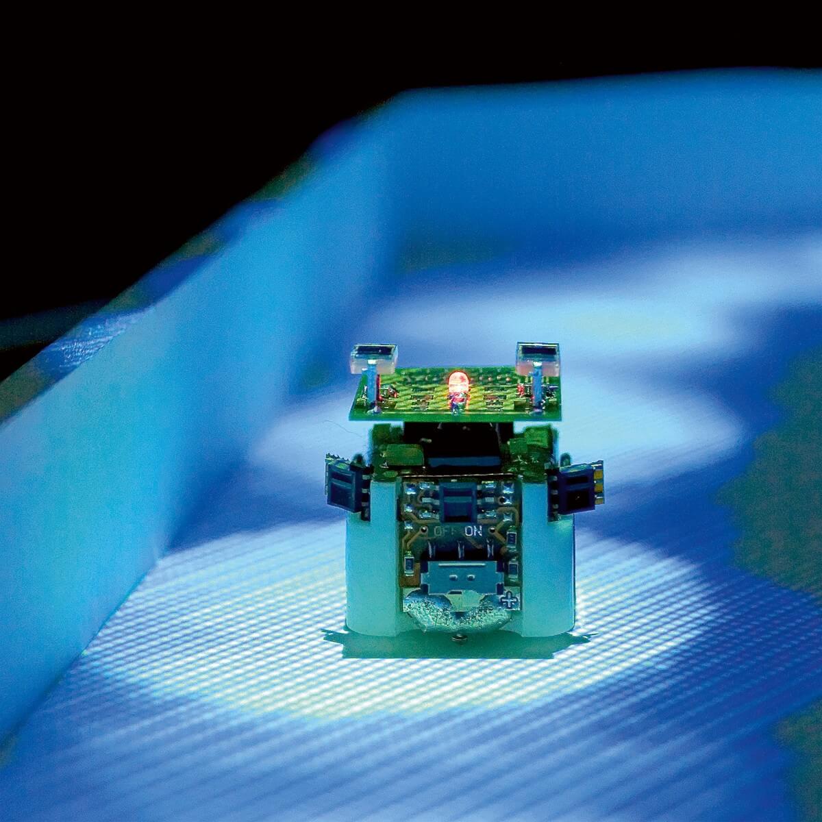 Au-dessus du labyrinthe, une caméra repère la position de chaque mini-engin et envoie cette information à un ordinateur qui projette, derrière le robot, un rond de lumière bleue. Voilà sa phéromone de piste. Chacun est doté d'un capteur lumineux et est attiré par les endroits où la densité lumineuse est la plus forte. Au fur et à mesure de leurs déplacements aléatoires, les robots créent eux aussi des pistes. Et trouvent le chemin le plus court. Comme celle des fourmis, la trace disparaît avec le temps.
