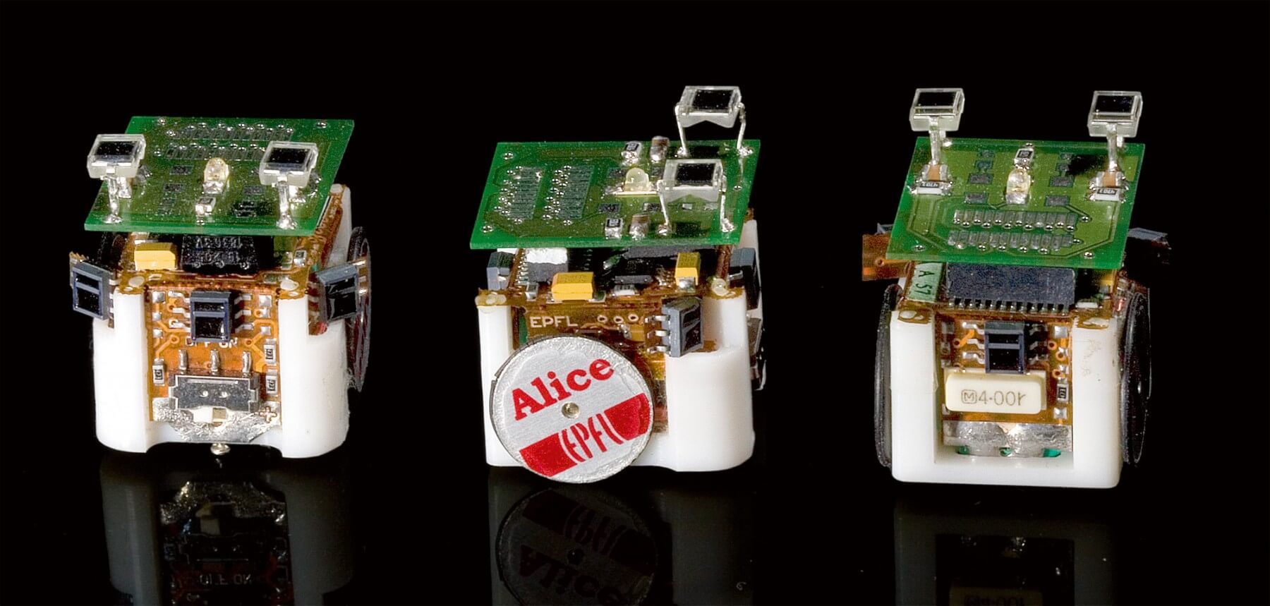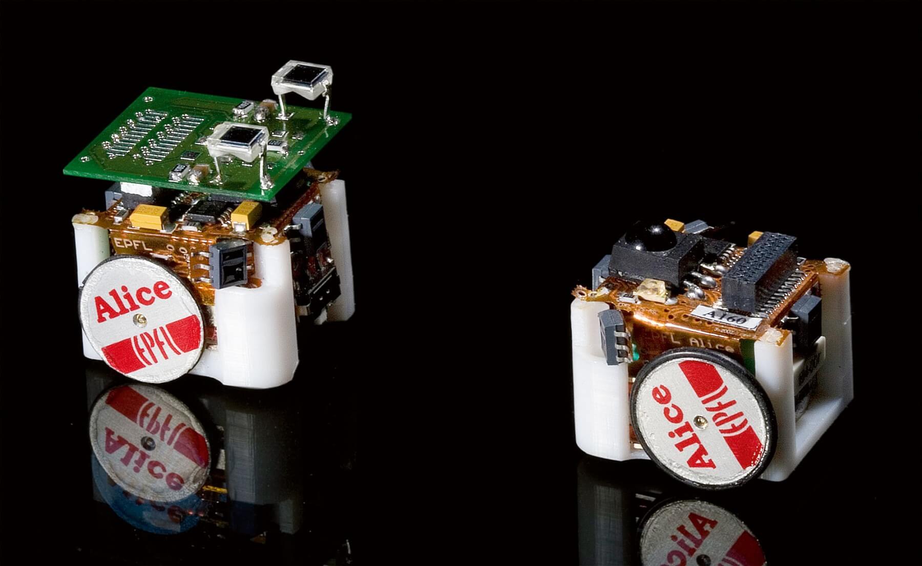 Notre équipe collabore avec l'Ecole Polytechnique Fédérale de Lausanne. Nos collègues suisses ont conçu et réalisé ces petits cubes à deux roues. On propose aux robots le même problème qu'aux fourmis : trouver le plus court chemin pour atteindre une source de nourriture virtuelle. Quand ils la trouvent, les robots reçoivent un signal et passent alors en mode « dépôt de phéromone ».
