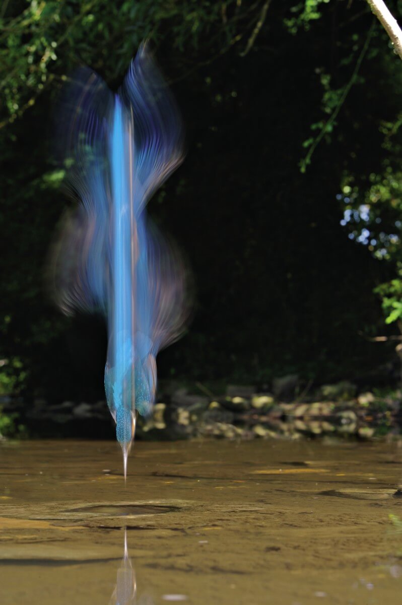 Souvent précédée par un tit-tiiit suraigu, l’apparition du martin-pêcheur évoque un éclair ou une flèche bleue hyperrapide. Cette impression de vitesse est accentuée par sa petite taille, par sa trajectoire directe et aussi par une étonnante capacité à effectuer des virages presque à l’équerre.