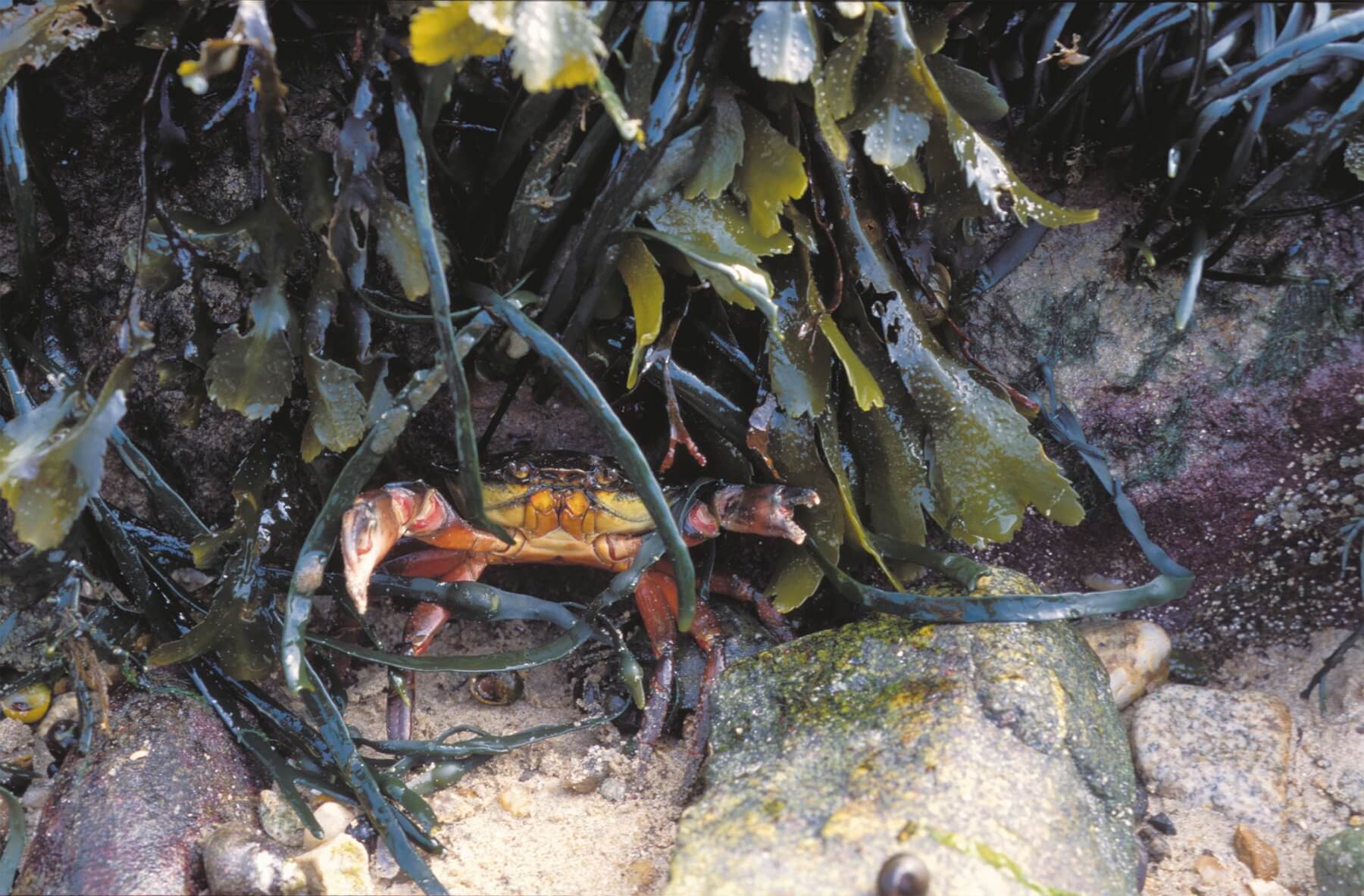 Crustacé agressif, le crabe vert survit tout en haut de l’estran. Pour échapper aux prédateurs et à la sécheresse, il se cache sous les algues ou dans les fissures. C’est l’eau retenue dans la cavité abritant ses branchies qui lui permet de respirer à marée basse.