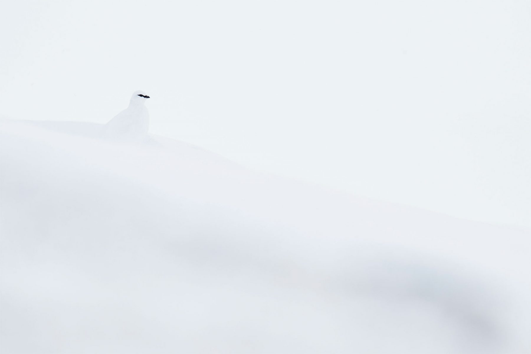 “De nouveau un oiseau que j’aime, de nouveau une ambiance minimaliste. Perdu dans la neige, si tu ne fais pas attention au trait noir qui relie son œil à son bec, jamais tu ne vois le lagopède alpin. C’est l’emblème de la montagne… et des menaces qui planent sur elle aujourd’hui.