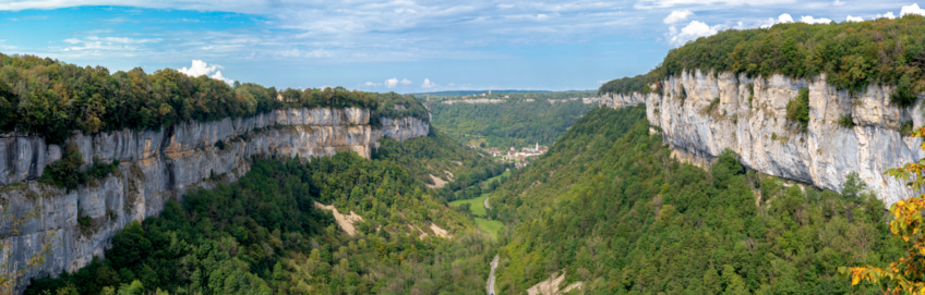 Le bout du monde est parfois au pas de la porte. Dans le Jura, les reculées, des vallées en cul-de-sac aux parois abruptes, sont surnommées bout du monde. La plus belle reculée est sans doute celle de Baume-les-Messieurs. Depuis 20 millions d’années, l’eau entaille le plateau calcaire du Jura en suivant des failles formées par les mouvements tectoniques. De nos jours, la reculée continue à se creuser vers l’amont. Dans le cirque qui ferme l’extrémité de la gorge, une rivière surgit d’un dédale de cavités souterraines. L’érosion due au gel et à l’eau forme des grottes qui s’agrandissent puis finissent par s’ébouler, élargissant peu à peu le cirque.
