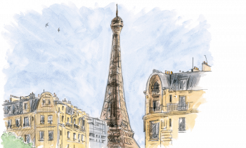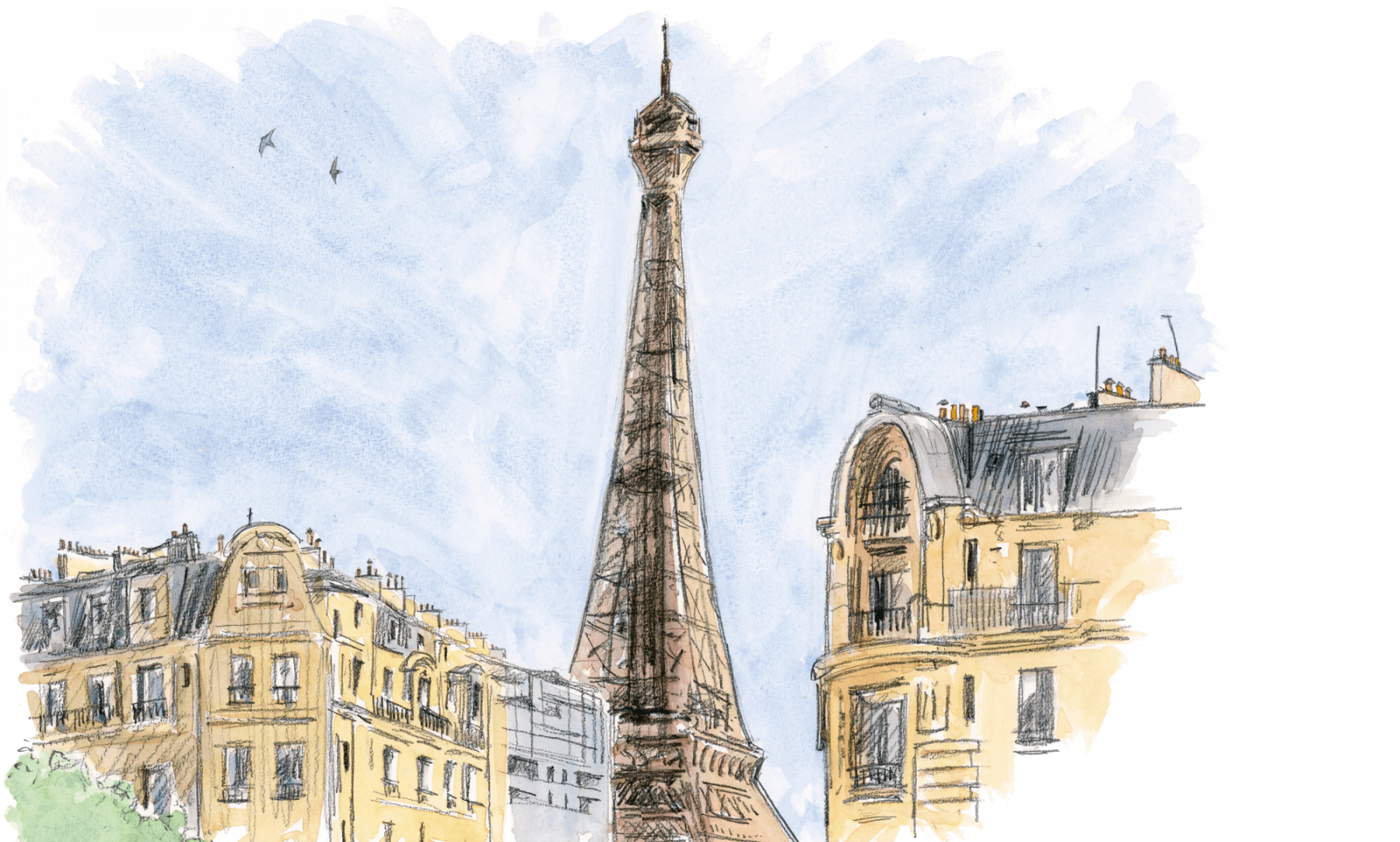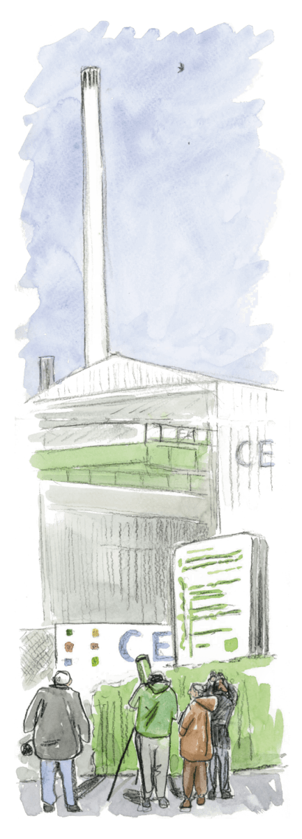 Sa longue-vue pointe au sud. Son calepin est maintenu dans la main gauche tandis que la droite suit un crayon d’une vivacité remarquable. L’artiste franco-japonais désigne alors une immense cheminée blanche. « C’est là ! » lance-t-il avec le sourire. Juste sous le sommet de l’édifice, une lucarne laisse apparaître le nichoir posé pour les faucons crécerelles il y a quinze ans mais occupé aujourd’hui par les pèlerins. Les rapaces auraient pu choisir un logement plus prestigieux dans le riche patrimoine de la ville. Mais à bien y regarder, ils règnent à près de 130 mètres de hauteur. La cheminée Front de Seine, destinée à évacuer les fumées des systèmes de chauffage, est en effet le quatrième bâtiment le plus haut de la commune de Paris.