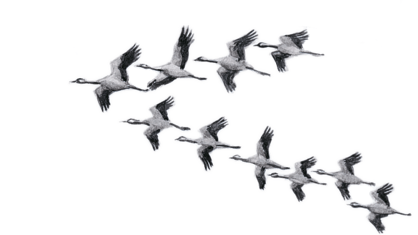La grue cendrée est l’un des rares oiseaux à migrer en famille. Les jeunes s’imprègnent en détail du chemin à suivre, d’où une extrême fidélité des voies de migration au fil des générations. La cohésion du clan est assurée par de fréquents cris de trompette.