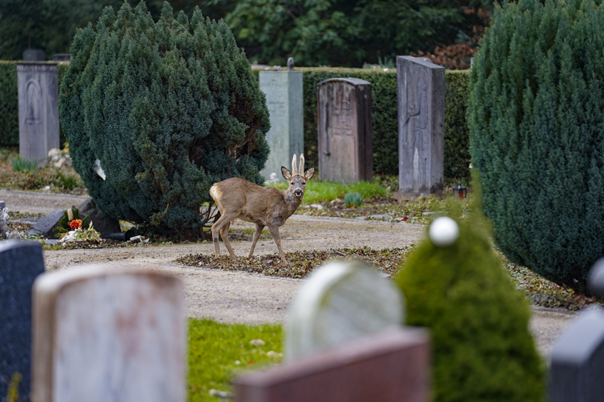 « Les chevreuils ne pouvaient plus sortir du cimetière, dont les accès donnant sur la forêt voisine ont été fermés au fil des années. Évidemment, les fleurs des tombes étaient très attrayantes pour eux. Ce menu fantastique était en plus renouvelé chaque jour. Cela dérangeait beaucoup de visiteurs en deuil de voir que leurs présents étaient broutés. Mais pour d’autres personnes, c’était un ravissement de voir ces animaux élégants se promener entre les tombes. »