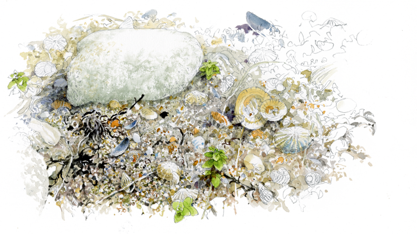 Fouillons encore… Un beau coquillage gris et ocre à la forme bombée se distingue par ses sillons et reliefs disposés comme des rayons. Le stéréotype du genre. Contrairement à la telline qui est détritivore, cette bucarde, cousine des coques, filtre le phytoplancton en suspension dans l’eau – elle est suspensivore. L’eau entre par un siphon inhalant et ressort par un siphon exhalant. Le courant qui la traverse ainsi lui permet de s’alimenter, de respirer, mais aussi d’évacuer ses déjections.