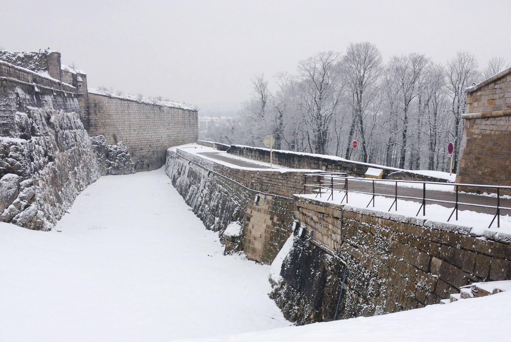 13 février. La neige a débordé du Jura jusqu'en plaine et avec elle est arrivé un froid polaire. Parti du Locle à la frontière franco-suisse, un petit train à deux wagons longe les canyons du Doubs. Après une heure quarante-cinq d'un trajet poussif mais magnifique, il débouche enfin devant l'imposante citadelle construite par Vauban. Bienvenue à Besançon, ville de rêve pour qui aime grimper en s'accrochant à la verticale. Partout, des falaises d'un seul tenant ou faites de moellons assemblés en murs, en tours, en clochers ou en fortins.