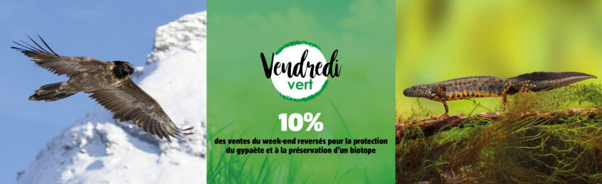 Pour la 4ᵉ année consécutive, la Salamandre dédie ce week-end «Vendredi Vert» à la consommation locale et aux actions concrètes en faveur de la biodiversité. Du vendredi 26 au dimanche 28 novembre 2021, 10% de tous les achats réalisés sur notre boutique en ligne seront reversés au profit de la protection du gypaète et pour la restauration d’un habitat pour les amphibiens.