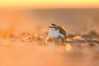 Le meilleur moyen de photographier les limicoles est de s’allonger au sol. Je me recouvre d’un filet beige pour casser ma forme de bipède et pose mon télé-objectif au ras du sable afin d’obtenir de belles zones de flou. Je passe alors ma soirée à les observer et les photographier jusqu’au coucher du soleil, bercé de belles teintes allant du jaune orangé jusqu’au rose-violet. Ce soir-là, je ne ferai aucune image de la femelle avec les jeunes. J’apprendrai plus tard, grâce à James, que c’est le mâle qui élève les poussins pendant que la femelle cherche un nouveau partenaire pour une seconde couvée. »