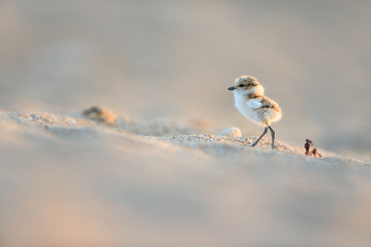 Au fil des années, j’ai parcouru les plages au lever et au coucher du soleil afin de mettre cet oiseau en valeur dans les lumières douces que j’affectionne. L’un des moments les plus marquants s’est déroulé une année quand j’allais vérifier si des œufs avaient éclos. Ce soir-là, en arrivant, je remarque que l’adulte n’est plus au nid pour couver et aucun oiseau n’est visible autour de la cage de protection. Il n’y a plus d’œufs dans la cuvette, les poussins sont donc nés et vont être très difficiles à repérer, car leur plumage est couleur sable. J’aperçois alors une femelle. Je ne la quitte pas des yeux, pensant qu’elle va rejoindre ses poussins. Mais elle part se nourrir sur l’estran. Plus loin, un mâle reste proche d’un tas d’algues sur la laisse de mer. Il bouge peu. Je le surveille alors avec attention aux jumelles et distingue deux petites têtes sortir de son plumage. Puis, un troisième poussin apparaît dans les algues.