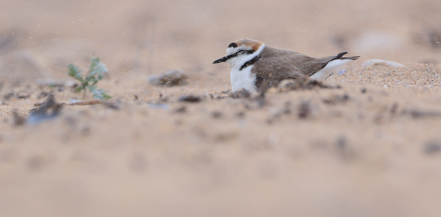 Je scrute le haut de la plage aux jumelles, mais aucune silhouette en vue… Je distingue finalement un mâle en train de se nourrir sur une laisse de mer. Pas de trace de la femelle, elle doit couver. J’entame alors un balayage minutieux de la zone. Au bout d’une dizaine de minutes, je localise enfin la couveuse, bien posée sur ses œufs.