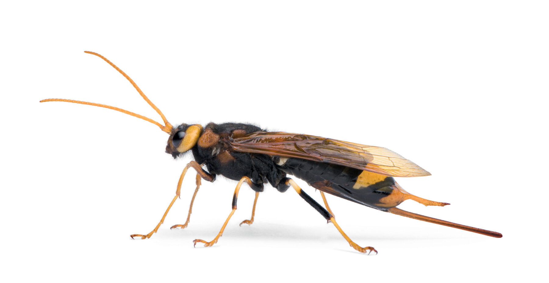 Malgré une longueur impressionnante atteignant 4 cm, le sirex géant est totalement inoffensif. Ce symphyte pond des œufs dans le bois. Son long appendice à l’arrière de l’abdomen n’est qu’un ovipositeur, c’est-à-dire un tube creux que la femelle enfonce à travers l’écorce. Au cœur d’un épicéa ou d’un sapin éclôt ensuite une larve qui se met à dévorer le bois.