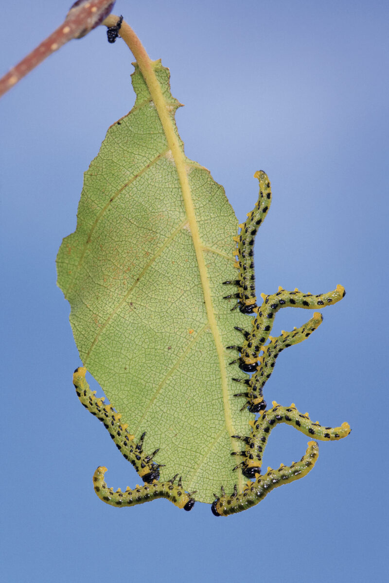 Les larves des symphytes sont herbivores. Rosier, saule, pin, frêne… Chacune a sa plante préférée. Ces croqueuses de feuilles ont pris l’aspect de chenilles de papillons. Alors, comment différencier les unes des autres ? Les larves de guêpes ont deux ocelles noirs bien visibles sur le front et au moins six paires de pattes à l’arrière des trois paires habituelles, alors que les futurs papillons en ont maximum cinq. En plus, ces fausses chenilles agitent l’arrière de leur corps en forme de S lorsqu’elles sont dérangées.
