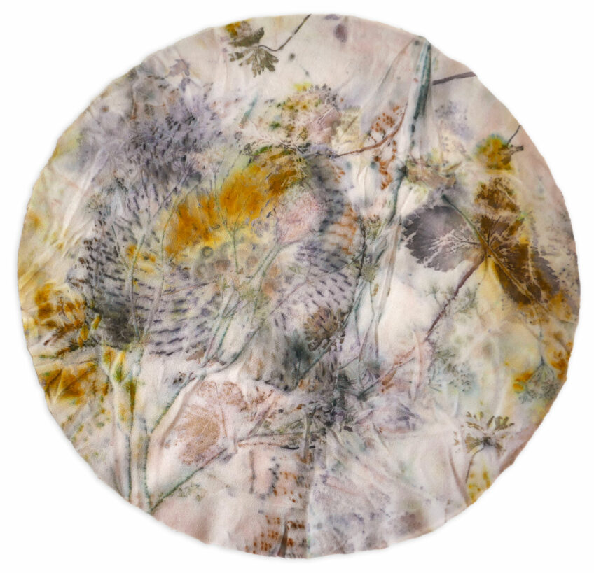 Ces tableaux sont des textiles libres, non tendus sur un châssis. Les empreintes, traces et couleurs qu’ils arborent sont le résultat d’une alchimie complexe qui se déroule dans le secret d’un petit paquet bien serré fait de tissu, de plantes et parfois de bouts de métal oxydé. Le tout est soumis à la chaleur et à l’humidité d’une cuisson douce. Puis, je laisse reposer quelques jours, avant d’ouvrir le cadeau qui m’est offert par les pigments que les végétaux libèrent. C’est un moment de révélation, au sens du processus photographique.