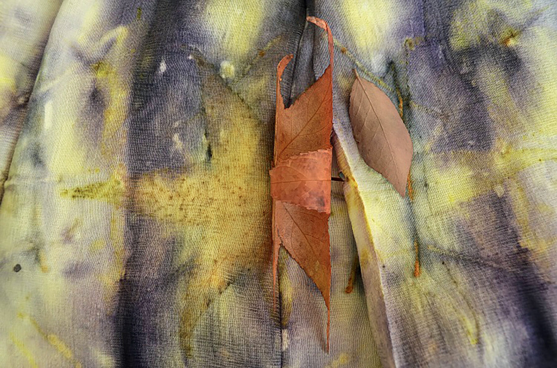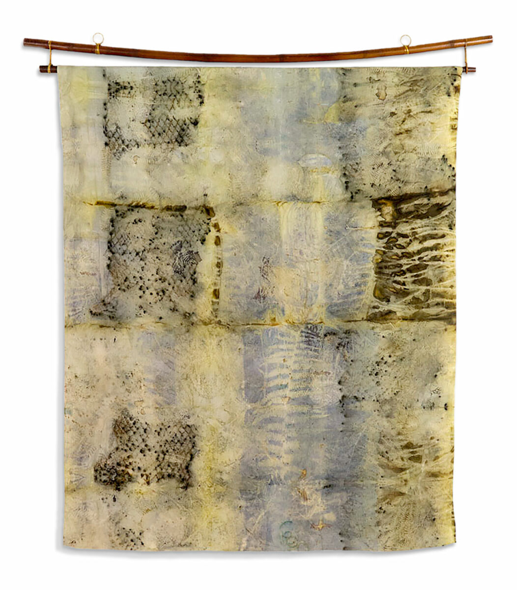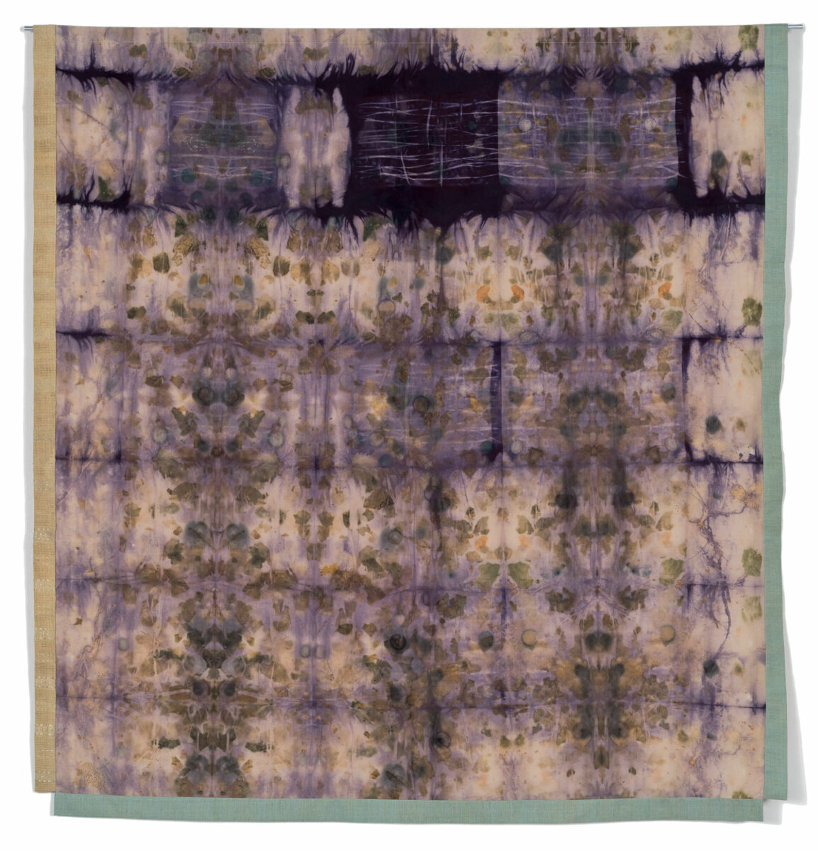 Toile de coton filé et tissé à la main, frondes de fougères, feuilles de cotinus, grillage de fer rouillé et décoction de bois de campêche.