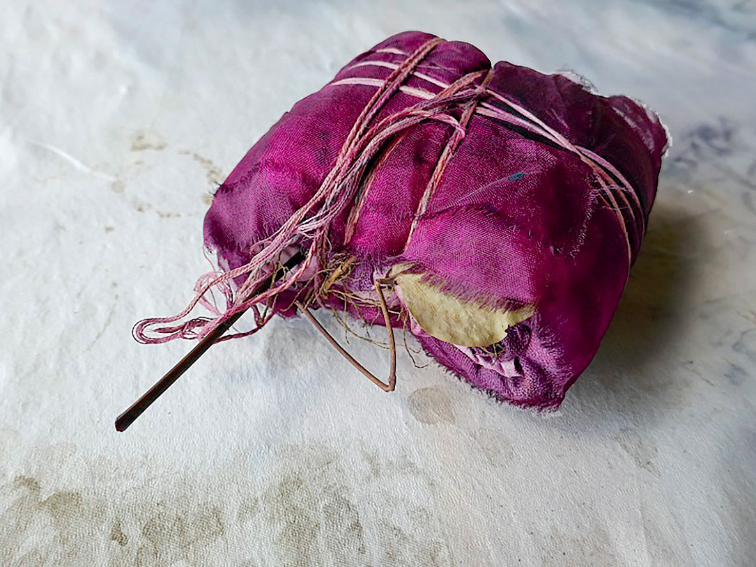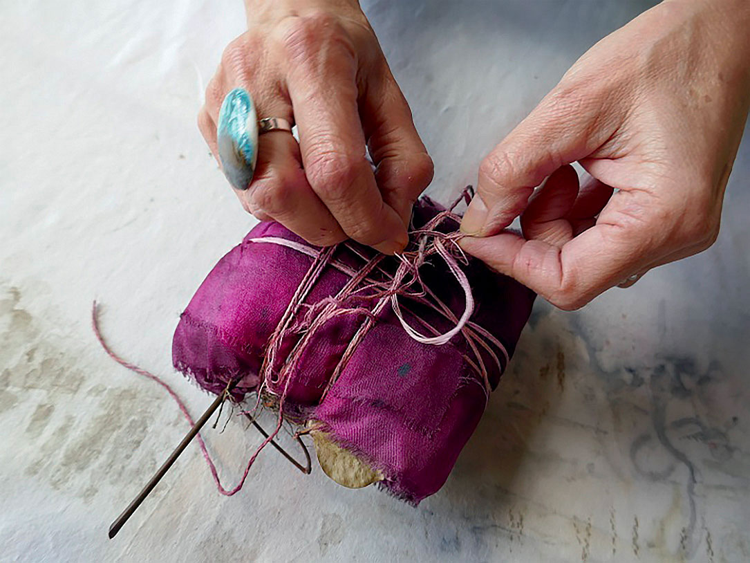 D’une marmite de teinture fumante, Catherine de Robert extrait de petits paquets faits de tissus, de plantes et d’objets métalliques étroitement ajustés. Quels motifs et couleurs vont-ils révéler une fois déballés ?