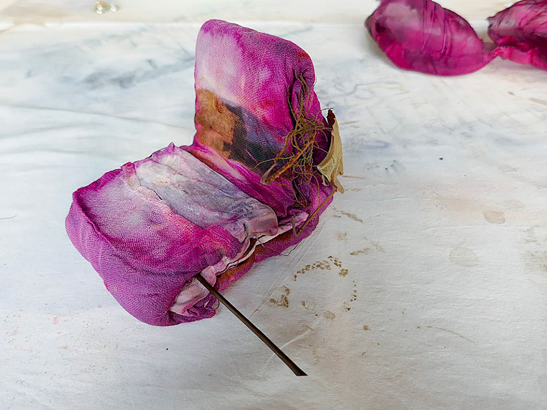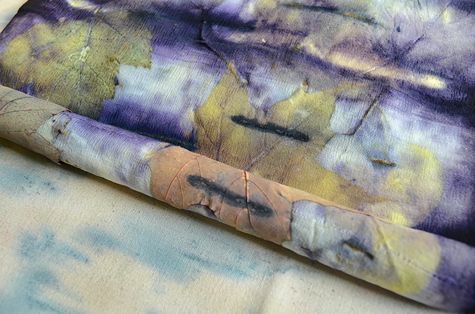 Ces tableaux sont des textiles libres, non tendus sur un châssis. Les empreintes, traces et couleurs qu’ils arborent sont le résultat d’une alchimie complexe qui se déroule dans le secret d’un petit paquet bien serré fait de tissu, de plantes et parfois de bouts de métal oxydé. Le tout est soumis à la chaleur et à l’humidité d’une cuisson douce. Puis, je laisse reposer quelques jours, avant d’ouvrir le cadeau qui m’est offert par les pigments que les végétaux libèrent. C’est un moment de révélation, au sens du processus photographique.