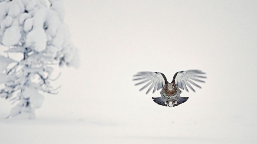 Habitant les endroits montagneux reculés, et sensibles au dérangement, les tétras-lyres sont très difficiles à photographier. Et c’est justement ce qui m’a fait envie. Après avoir immortalisé les oiseaux à plusieurs reprises au téléobjectif, je souhaitais expérimenter quelque chose de nouveau. J’ai donc tenté ma chance avec un déclencheur à distance et un objectif grand-angle : j’ai installé mon matériel au bon endroit un soir, et mon plan a fonctionné du premier coup le lendemain matin.