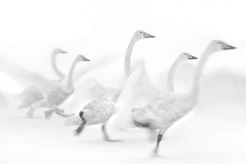 En pleine tempête de neige au Japon, j’ai décidé d’aller voir un lac gelé. J’espérais y trouver des cygnes chanteurs qui aimaient se tenir sur une zone d’eau libre. Par chance, des groupes isolés de ces oiseaux se trouvaient non pas dans l’eau, mais sur la glace et prenaient leur envol les uns après les autres. J’ai pris cette photo alors qu’ils passaient tout près de moi. J’ai volontairement choisi un temps d’exposition long pour obtenir cet effet d’essuie-glace !