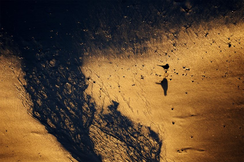 Cette image a été prise sur une plage du nord-ouest du Danemark. Je voulais en fait photographier à contre-jour le ruisselet qui s’écoulait dans la mer, lorsque cette bergeronnette grise est soudain arrivée là. J’ai juste eu le temps de changer le temps de pose de l’appareil et de désactiver le relevage du miroir. L’instant d’après, elle était ressortie du cadre.