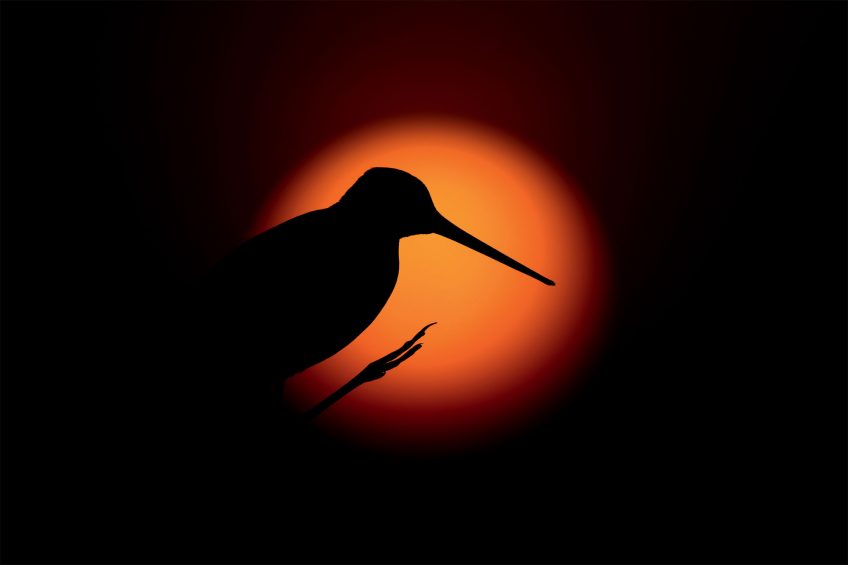 Ce soir-là, un soleil rouge vif se couchait dans un ciel sans nuage. Je voyais une barge à queue noire occupée à sa toilette vespérale sur un piquet de clôture. Je me suis positionnée de telle sorte que la tête de la barge se trouve exactement devant le soleil couchant et j’ai très fortement sous-exposé ma prise de vue. Lorsque la barge s’est grattée et que ses orteils se sont découpés en filigrane sur le disque de lumière rouge, j’ai appuyé sur le déclencheur.