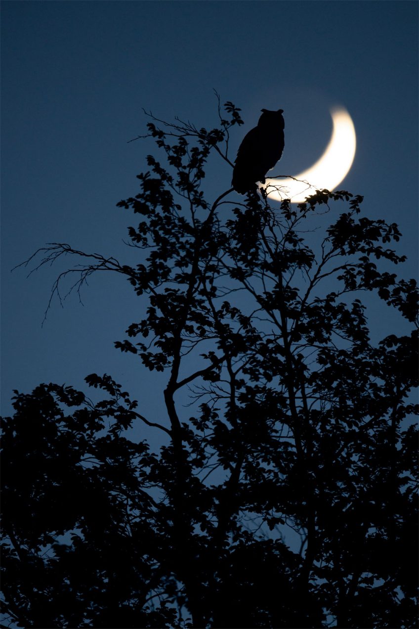 Photographier un grand-duc d’Europe devant la lune était mon souhait depuis longtemps, mais c’est resté une vaine tentative pendant deux ans. Soit un arbre faisait obstacle, soit le hibou était certes au bon endroit mais le ciel était nuageux. Ou alors la lune était parfaite, mais aucune trace de l’oiseau. Quel bonheur quand enfin tout a concordé et qu’un grand-duc s’est posé sur un perchoir dégagé, devant le croissant, comme assis sur la pointe.
