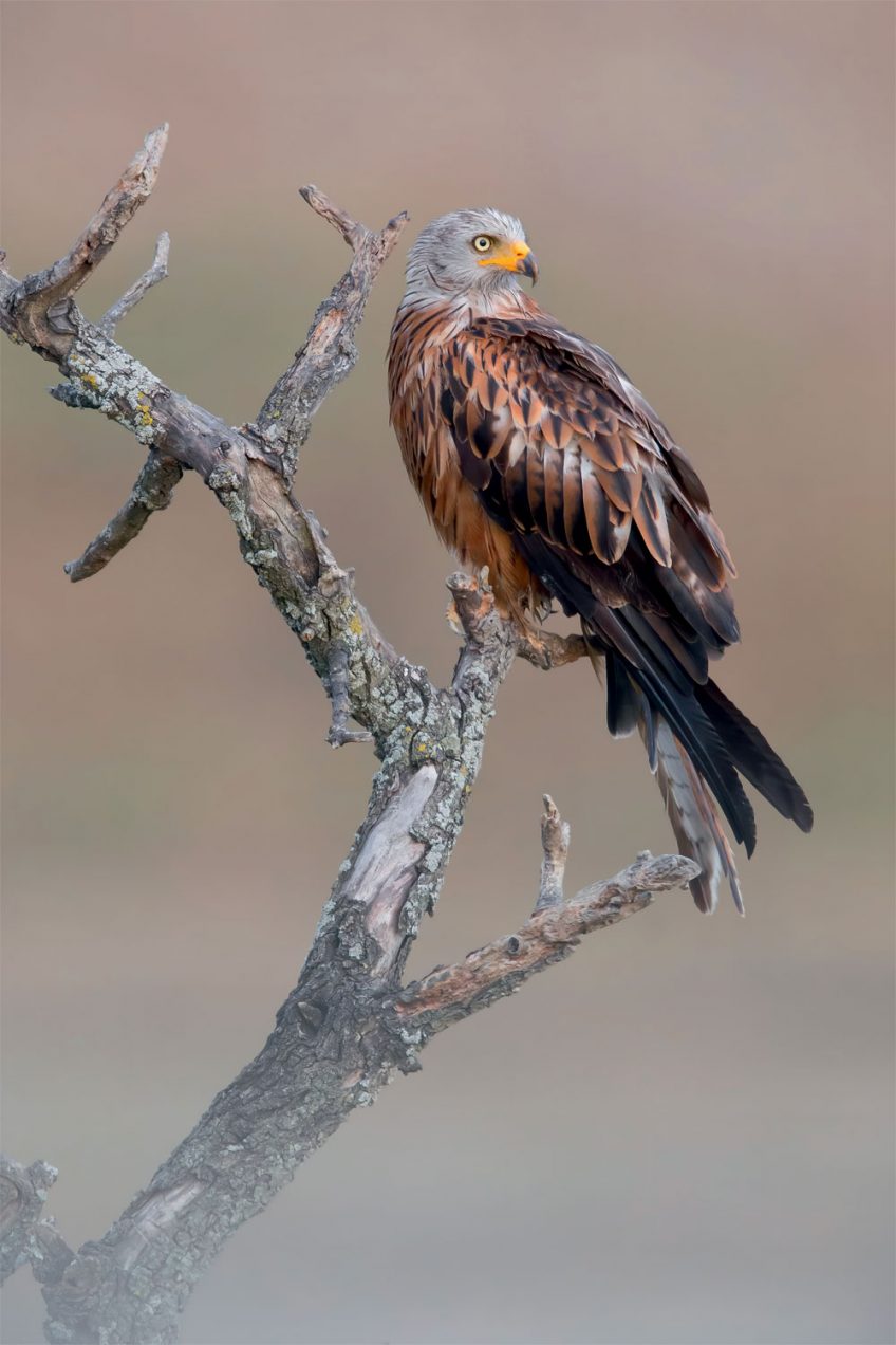 Pour réaliser cette image, j’ai placé mon affût à proximité d’un perchoir apprécié d’un milan royal. Un champ éloigné a doté l’image d’un arrière-plan paisible, tandis que le premier plan était illuminé par les derniers rayons du soleil couchant.