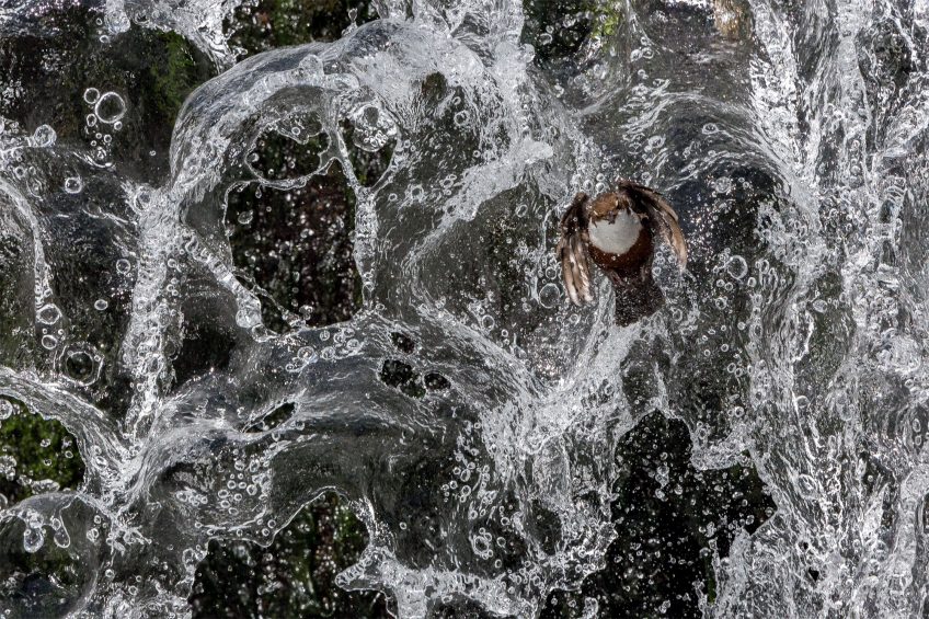 Je connaissais le site de nidification de ce cincle plongeur depuis quelques années. J’ai installé mon affût et j’y ai passé presque tous les matins pendant près d’un mois, jusqu’à ce que j’obtienne la photo de mes rêves : un cliché qui montre l’eau aussi nette que l’oiseau traversant la chute. J’ai ainsi réussi à rendre l’effet graphique de l’eau comme environnement du cincle plongeur en pleine action.