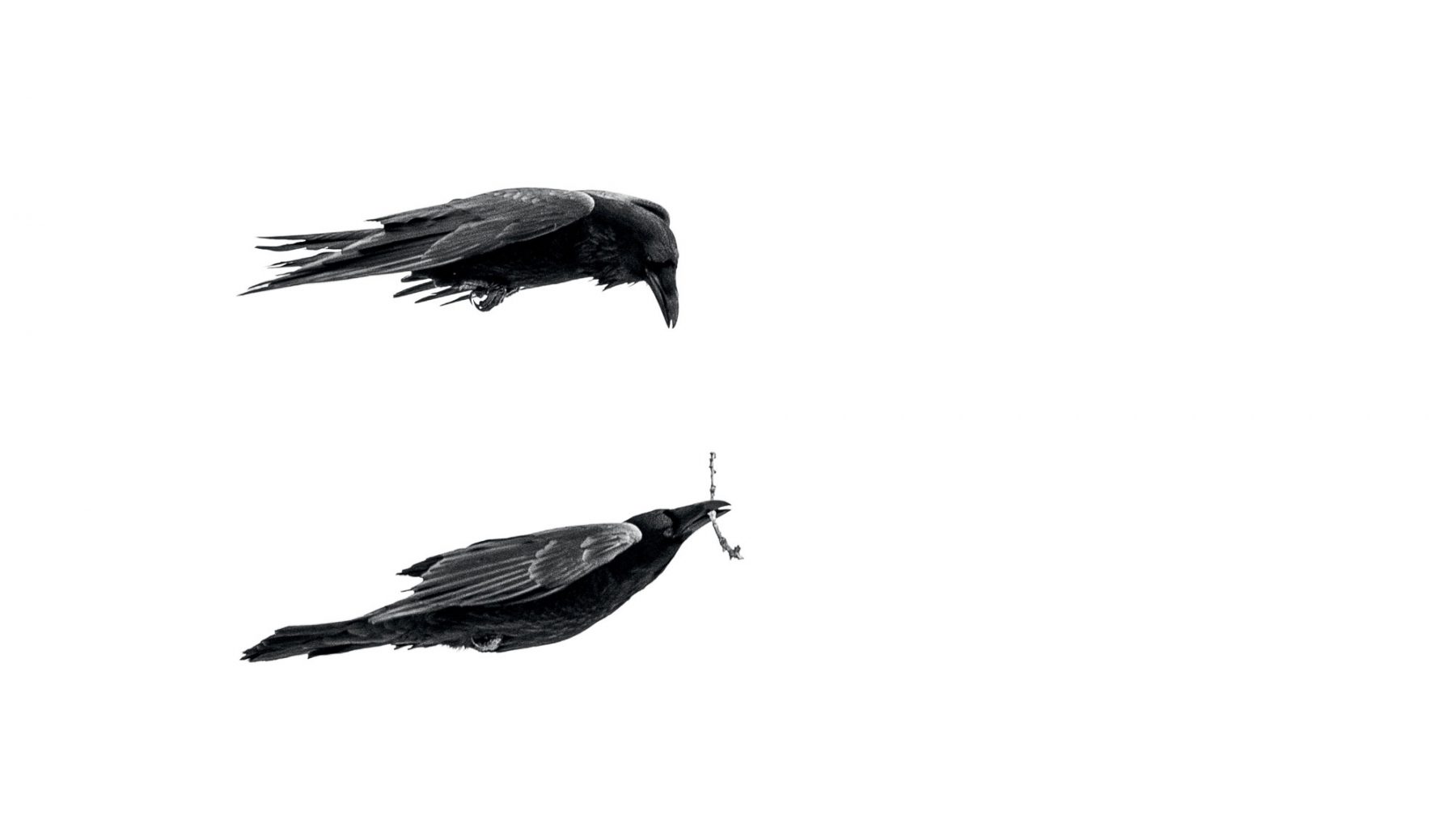 J’étais assis au milieu d’une forêt canadienne enneigée, lorsque mon attention a soudain été attirée par ces deux grands corbeaux. Ils sont arrivés ensemble, leurs vols presque synchronisés, l’un des deux portant une branche dans son bec. J’ai attendu le bon moment et j’ai appuyé sur le déclencheur. On pourrait imaginer que ces oiseaux sont amoureux, qu’ils pensent peut-être à leur prochaine nichée…