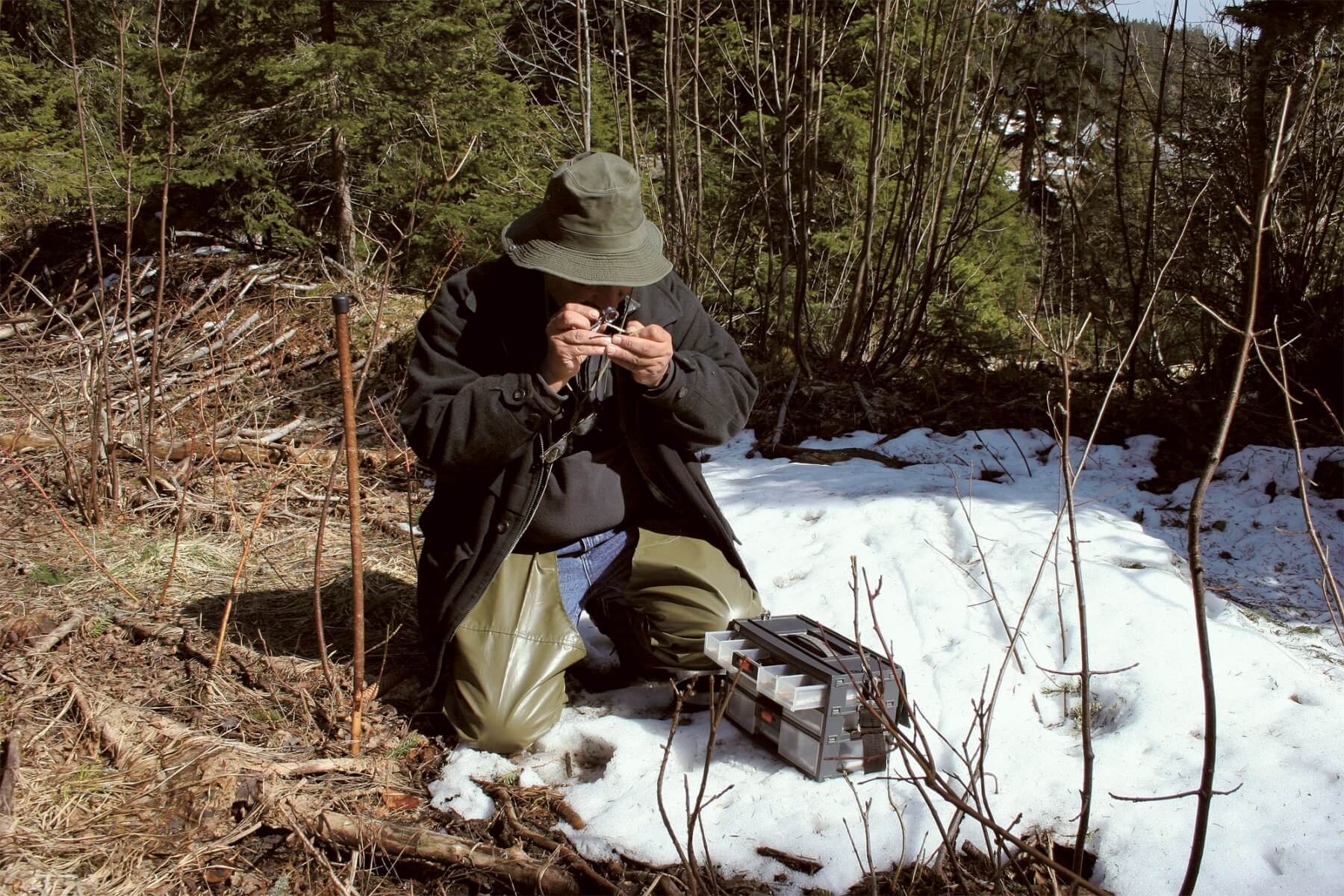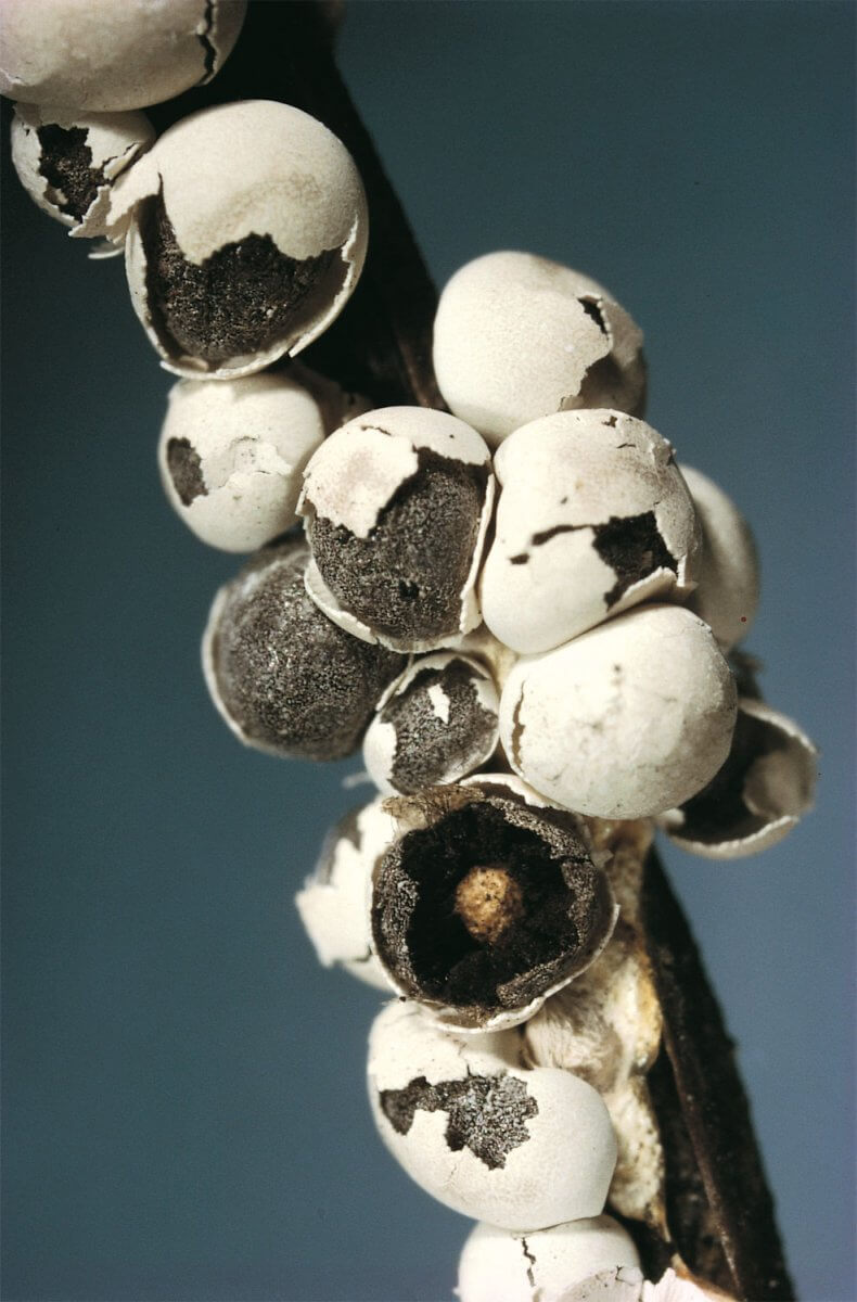 La pluie et le vent sont les ennemis des fragiles myxomycètes nivicoles. Visez une journée de beau temps succédant à quelques jours sans vent ni précipitations. Cherchez les fructifications aux alentours des vieilles plaques de neige, notamment sur les branches de ronce ou d’églantier. De loin, les plus courantes ressemblent à de petits manchons gris ou blancs. Sous la loupe, c’est une autre histoire…
