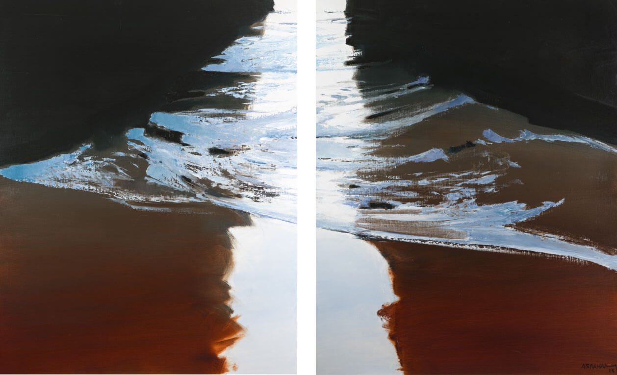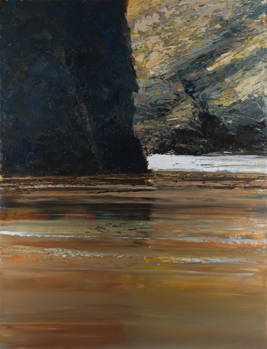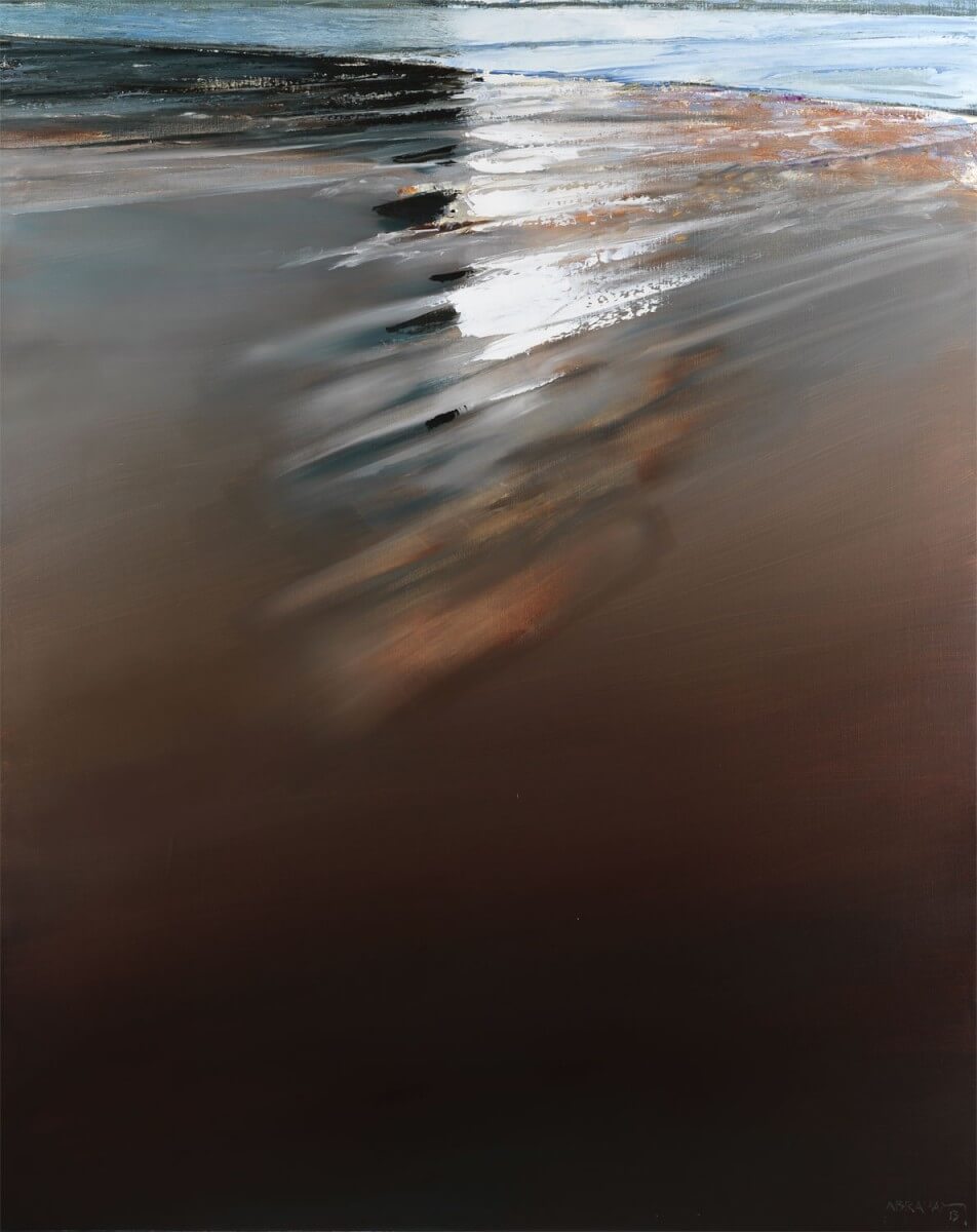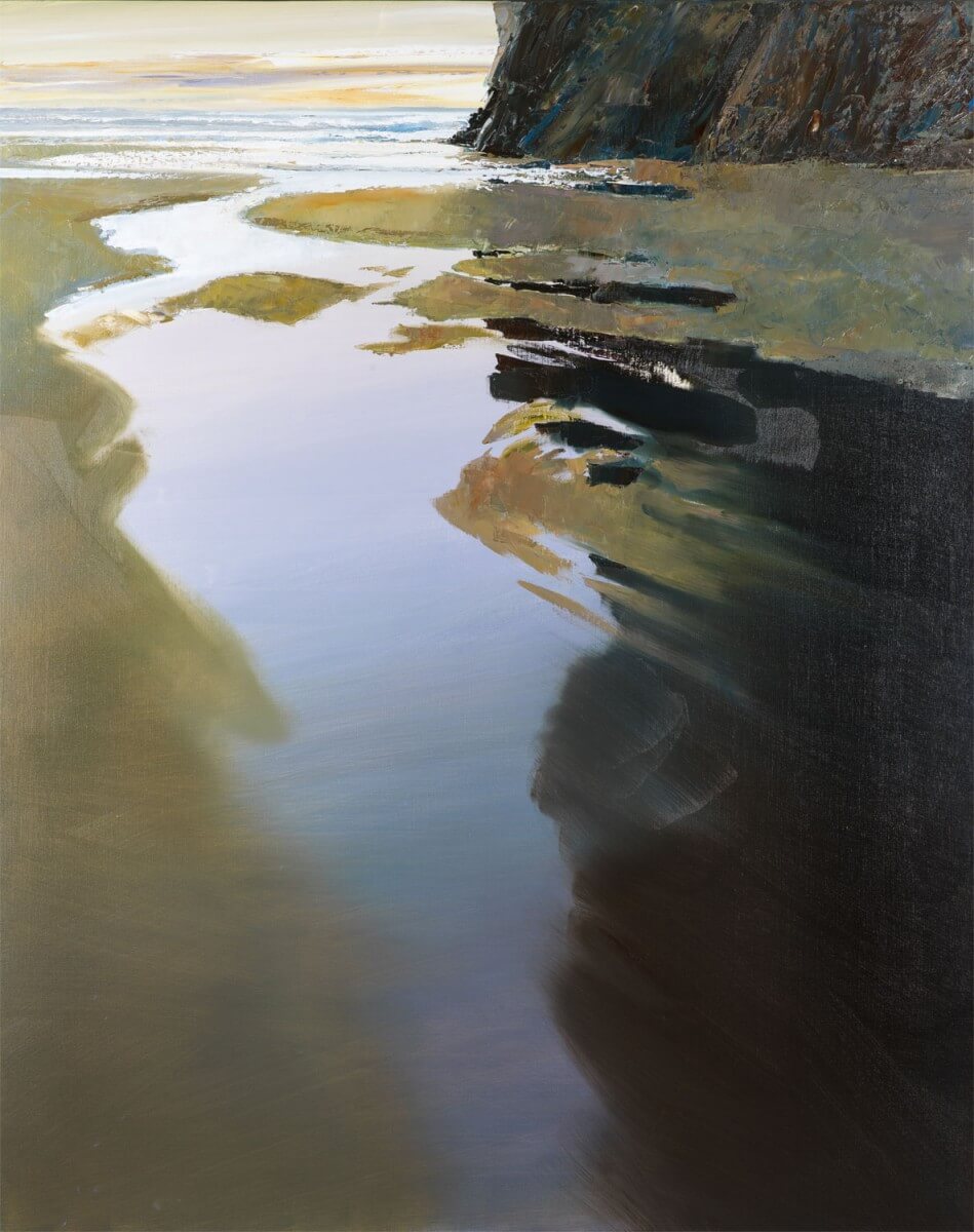 La mer joue de ses caresses pastel. Sur le sable, le ressac, le soleil et les nuages s'unissent pour créer une nouvelle œuvre chaque seconde. Bercé par l'écume, le continent s'égare alors dans le miroir de son érosion. De noir ébène, il vire au gris ardoise ou au sépia.