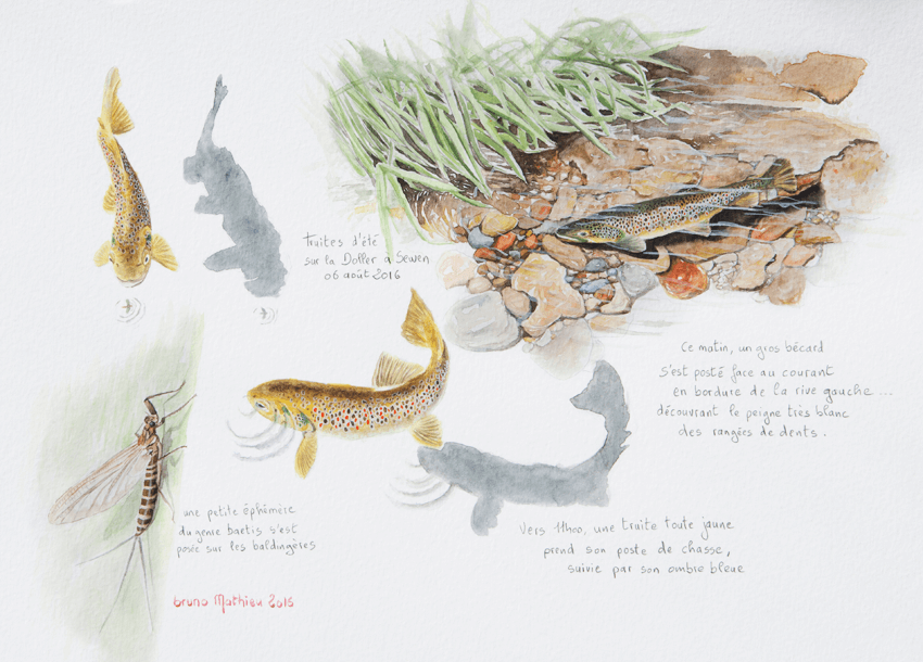 « A Sewen, la Doller quitte à peine les flancs escarpés du Ballon d’Alsace pour entrer dans la vallée. Toute jeune rivière de montagne, elle roule ses eaux fraîches et dépose ici et là de grosses pierres de granit. En plein été, lorsque les eaux sont basses et le temps lumineux, j’aime me poster à l’aube derrière le rideau vert des baldingères. C’est un excellent moment pour observer le manège des truites. Rassemblées sur les linéaires les plus profonds en cette période d’étiage, elles sortent régulièrement de leurs caches et prennent avec gourmandise les insectes qui dérivent au fil de l’eau. Ce matin, un gros bécard - c’est comme ça que les pêcheurs nomment les grands mâles aux mâchoires inférieures longues et recourbées - s’est posté face au courant en bordure de la rive gauche et cueille de minuscules larves qui dérivent. Je distingue nettement la grâce souple du poisson et le mouvement à peine perceptible de ses mâchoires mâchouillant la nymphe et découvrant le peigne très blanc des rangées de dents. D’autres truites de taille modeste s’affairent elles aussi dans une fébrilité juvénile. Vers onze heures, le soleil devient brûlant, la grande truite a regagné le calme de sa cache et une autre toute jaune en profite pour prendre son poste de chasse.»