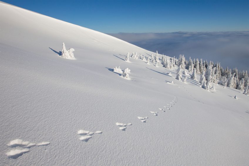 Wouah la vue ! Je suis enfin sorti de la forêt. La reine des neiges ne doit plus être loin… Je chausse mes raquettes et continue. Traces de lièvres et d’un renard comme dans une fable de La Fontaine.