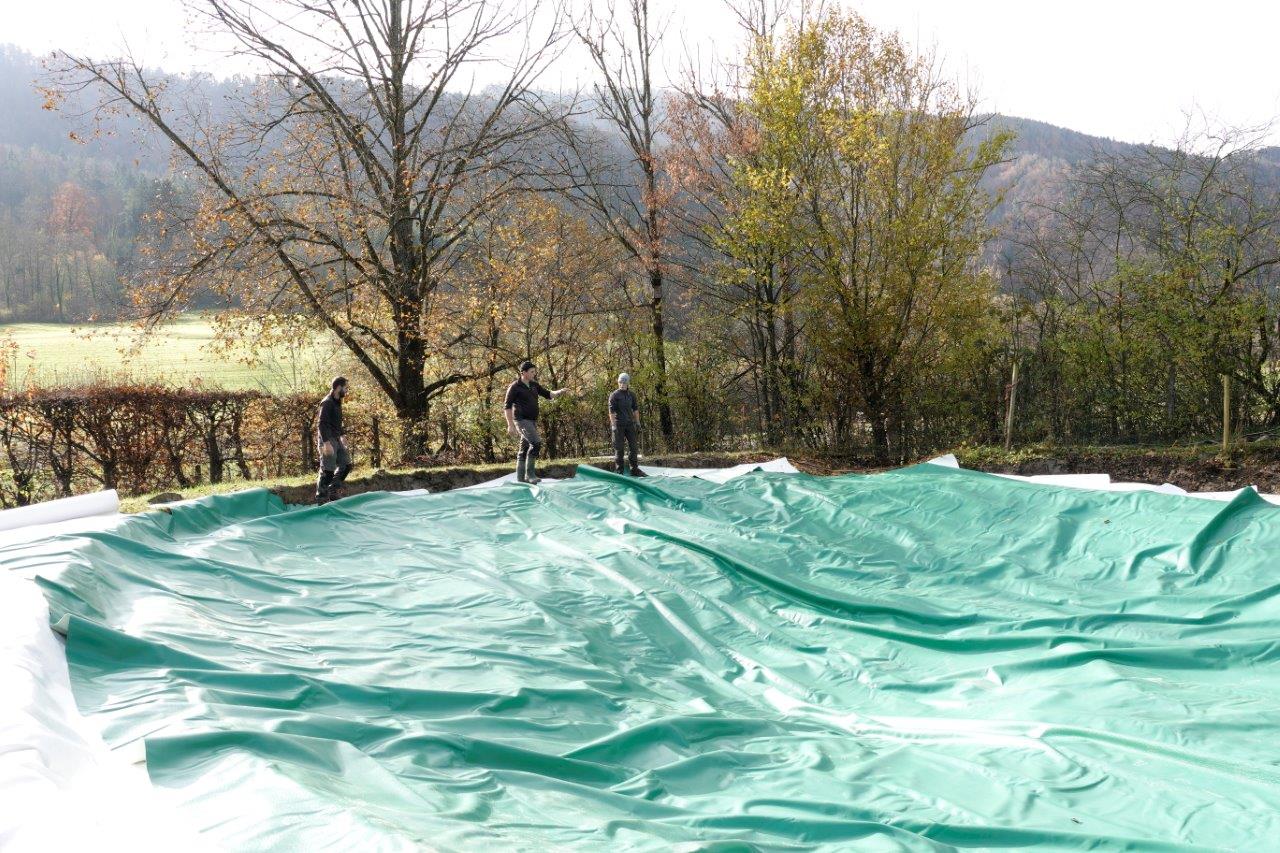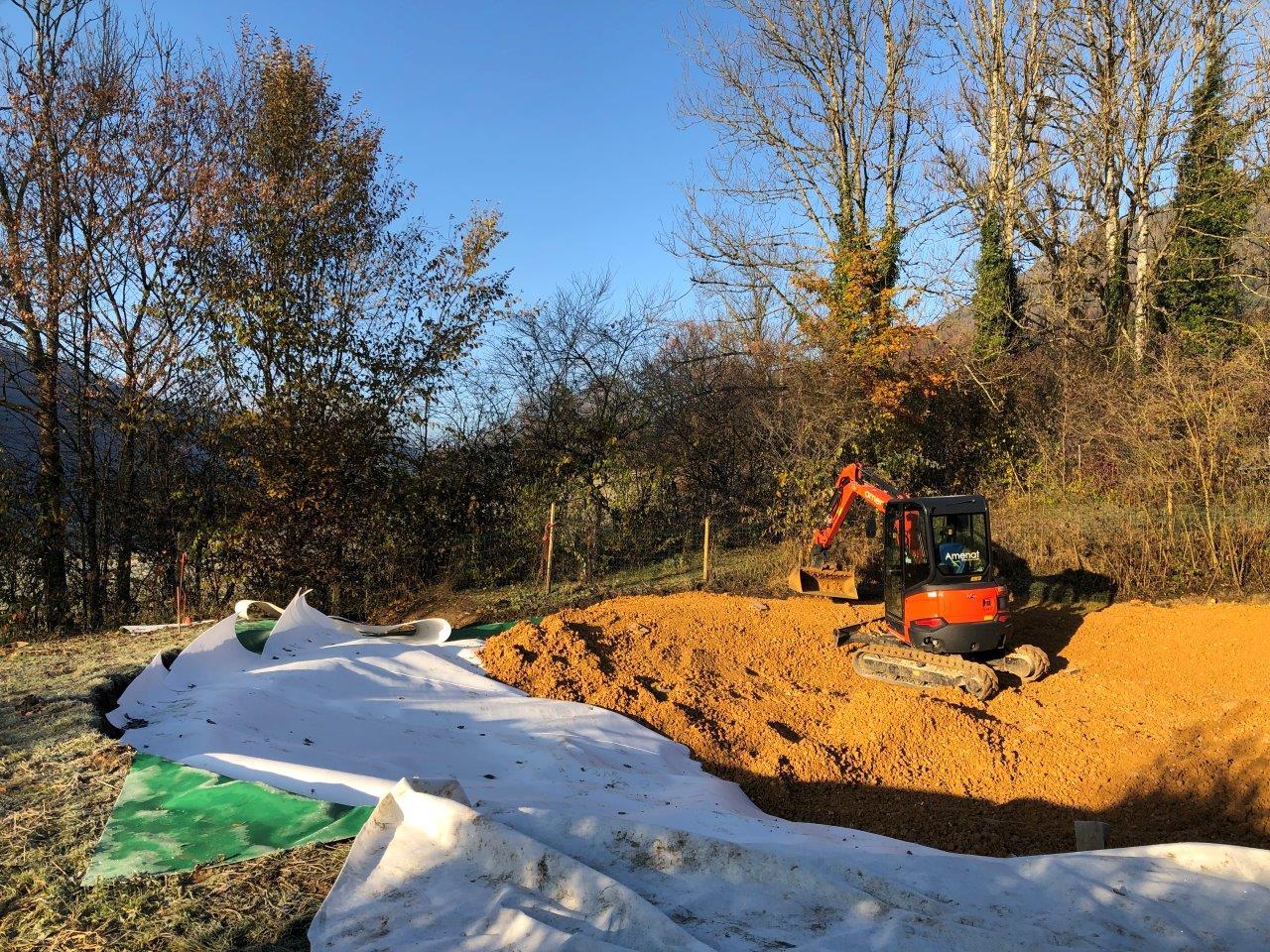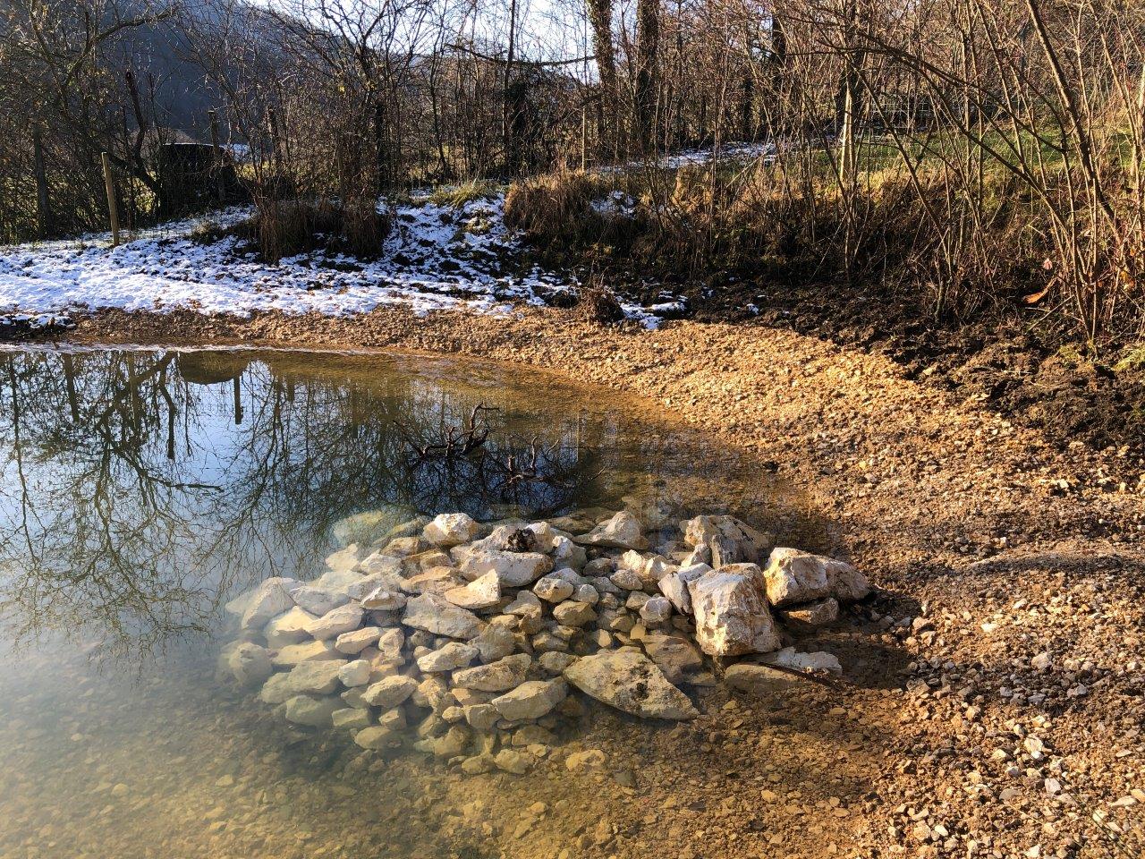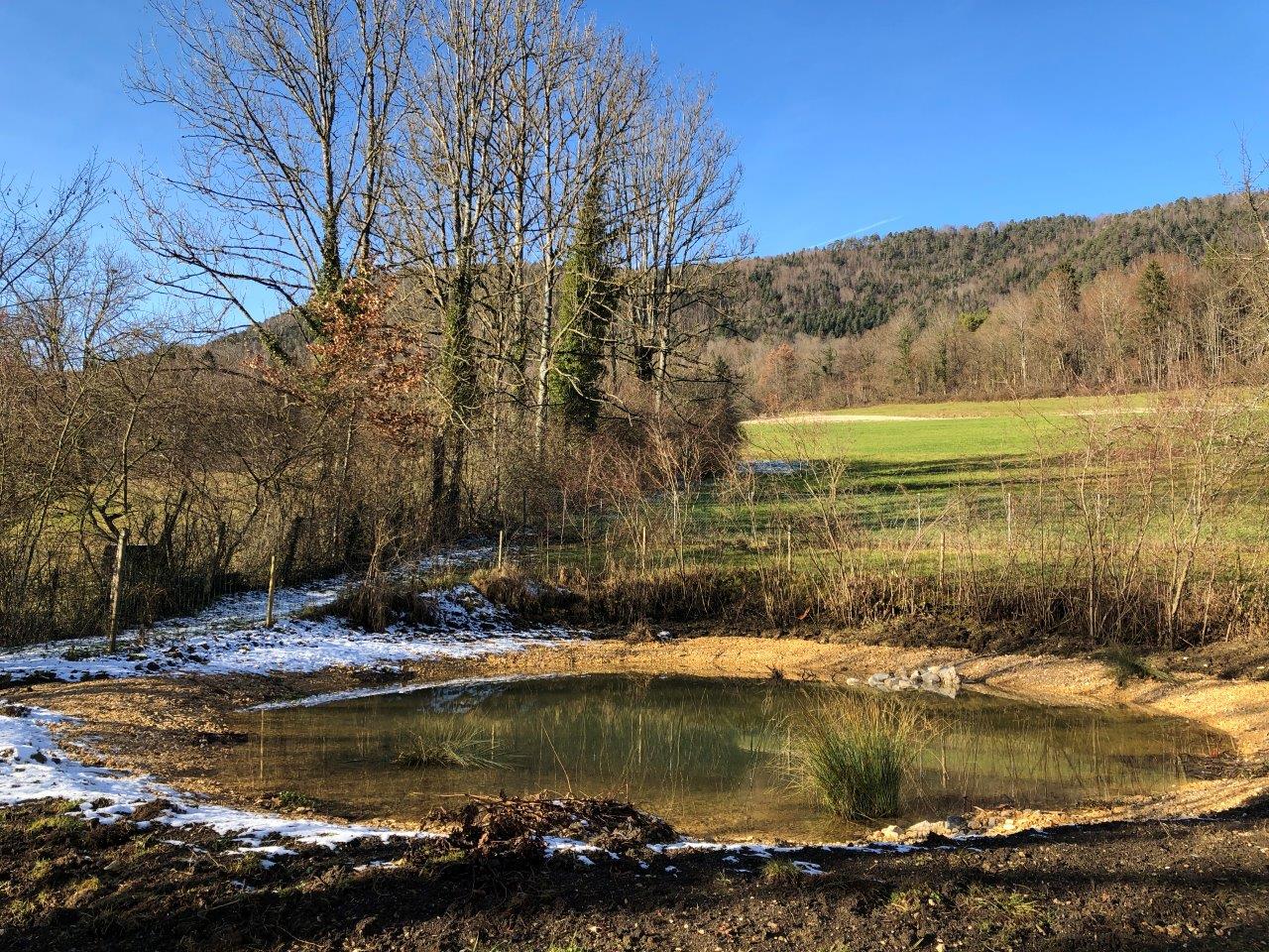 Les travaux de réfection de l’étang se sont déroulé en début d'hiver. Actuellement, le plan d'eau est encore très nu et présent donc un caractère plutôt pionnier. La bâche étanche a été recouverte de 25 cm de groise grasse, un revêtement minéral qui sera propice à la colonisation des plantes. Quelques aménagements mineurs peaufinent le chantier: plusieurs touffes de végétation ont été remises en place afin d’ensemencer les rives du biotope et un tas de cailloux ainsi qu'une souche ont été placés dans l’eau afin de diversifier les habitats. Grâce aux abondantes précipitations de décembre, le plan d'eau s'est vite rempli et sera donc prêt à accueillir une faune et flore variées dès le printemps prochain. A bientôt, les grenouilles!