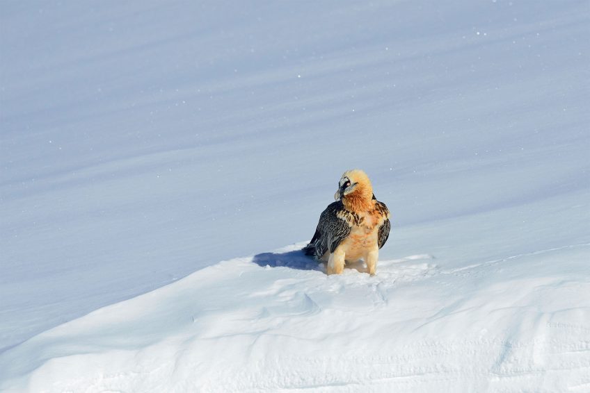 “Le gypaète explore souvent les couloirs à la recherche de mammifères victimes des coulées de neige meurtrières. Mais photographier cet adulte tout près d’une avalanche en train de dévaler restera à jamais gravé dans ma mémoire.