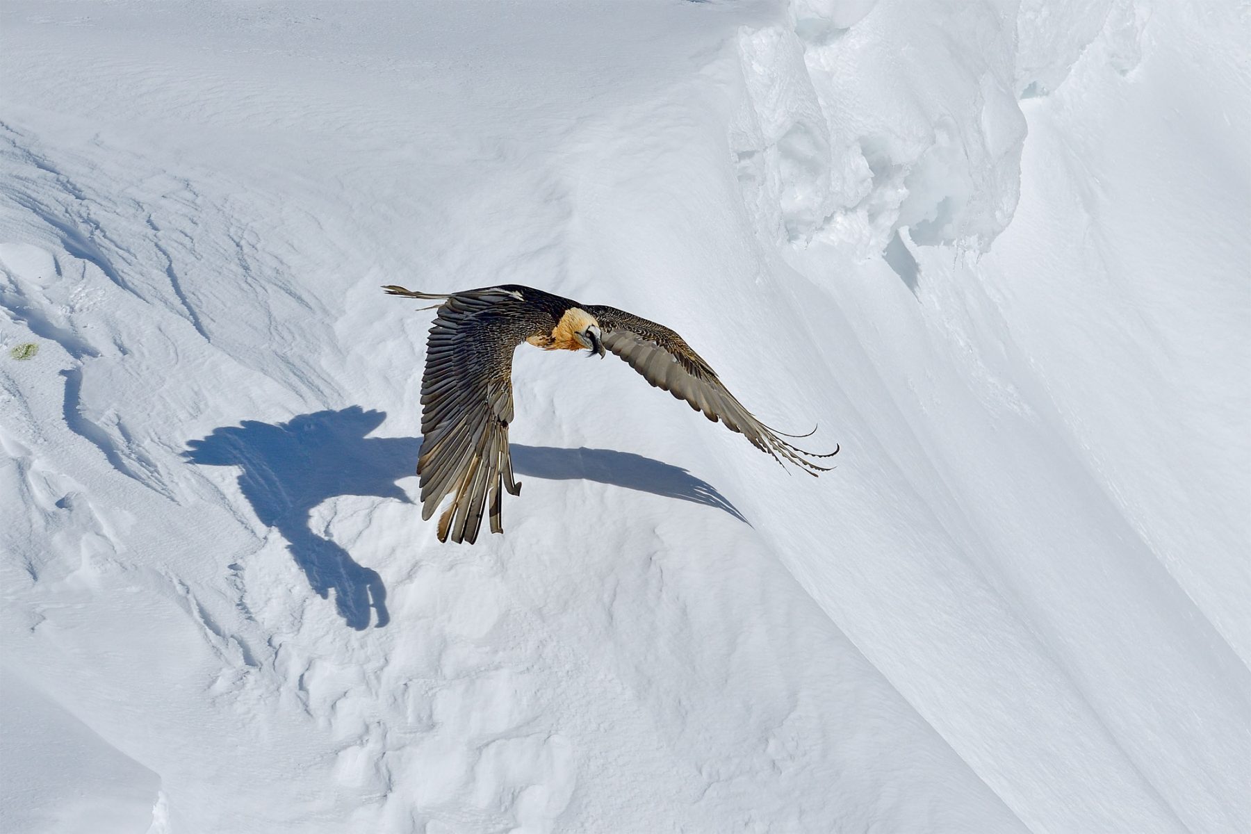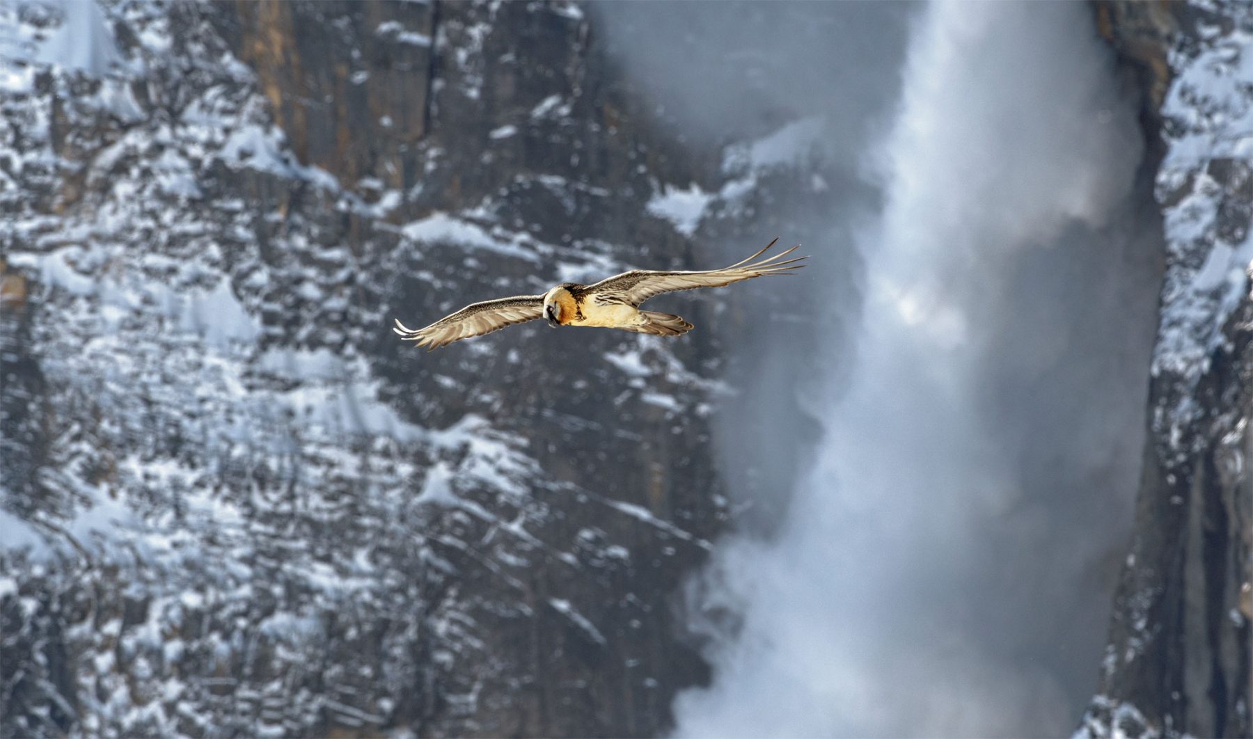 “Le gypaète explore souvent les couloirs à la recherche de mammifères victimes des coulées de neige meurtrières. Mais photographier cet adulte tout près d’une avalanche en train de dévaler restera à jamais gravé dans ma mémoire.