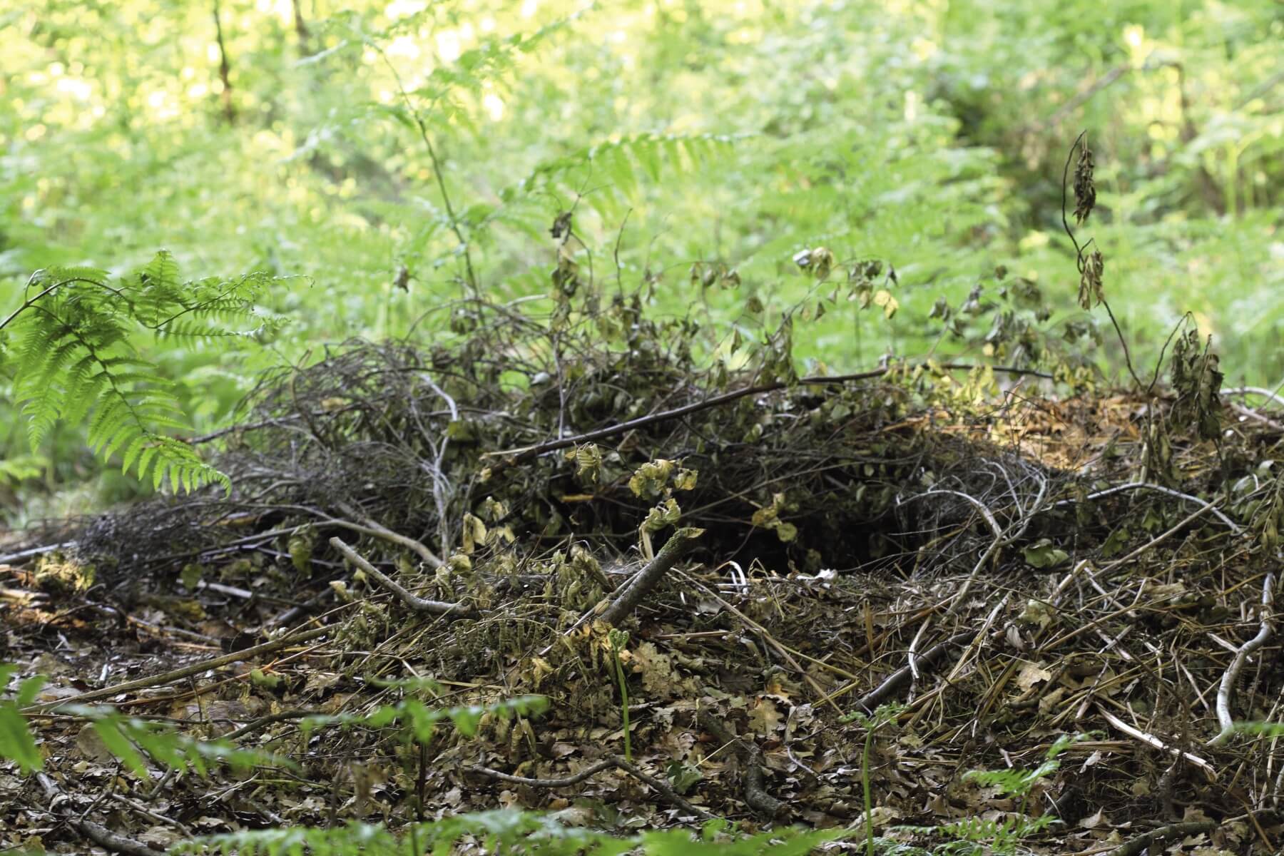 Puis voici enfin la fin mai. D’après mes calculs, il est temps de retourner dans le coin des bêtes noires pour un repérage. Plein d’espoir, j’arpente les bois pour croiser peut-être la route de la fratrie de sangliers. Après une recherche méticuleuse, voici aux abords d’une clairière remplie de fougères un premier indice prometteur : un chaudron ! C’est dans cette sorte de nid que la laie a probablement mis bas les marcassins. L’abri est constitué de branchages fraîchement sectionnés, au feuillage à peine fané.